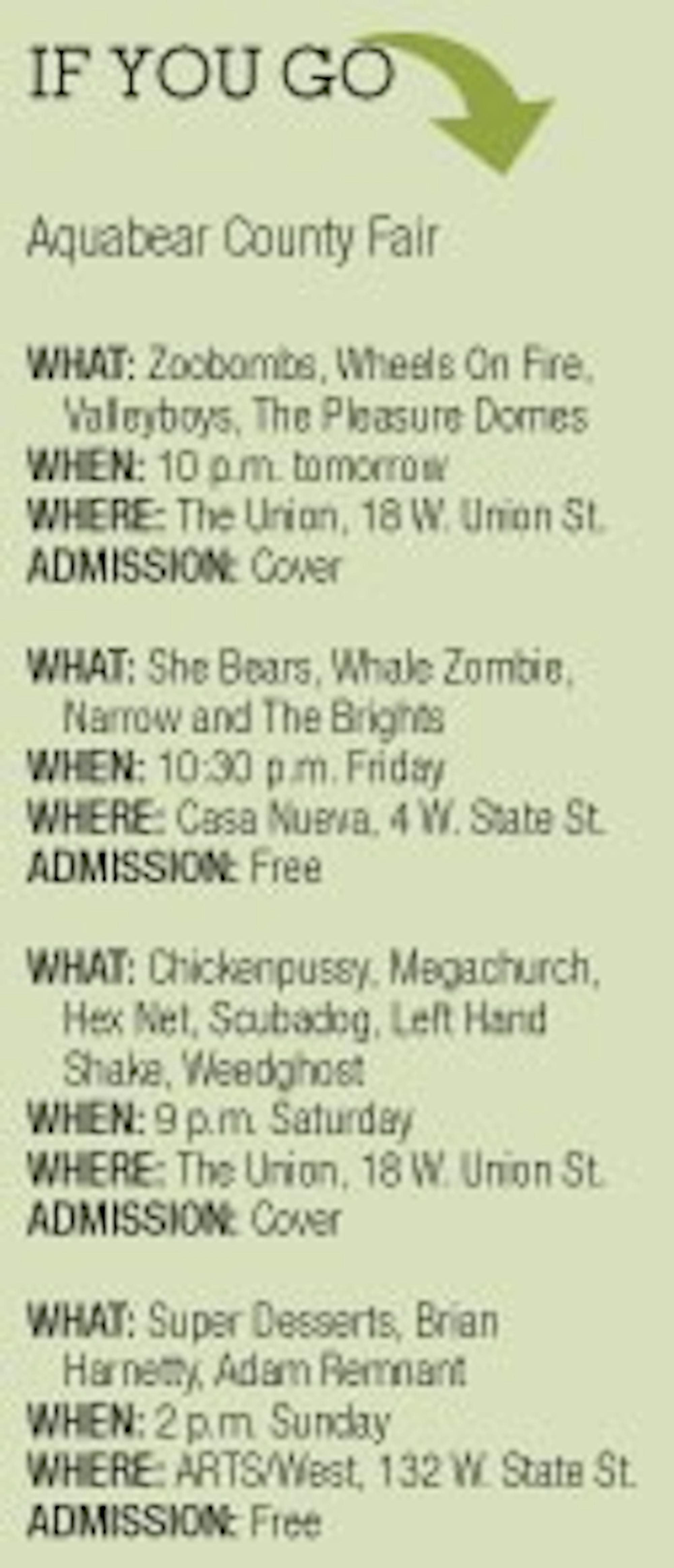 Aquabear Legion, an Athens-based group that promotes and supports musicians in Ohio, is hosting the County Fair for the fifth year in a row as a celebration of its mission. In all, 16 bands will perform at three different venues — The Union, Casa Nueva and ARTS/West — tomorrow through Sunday.