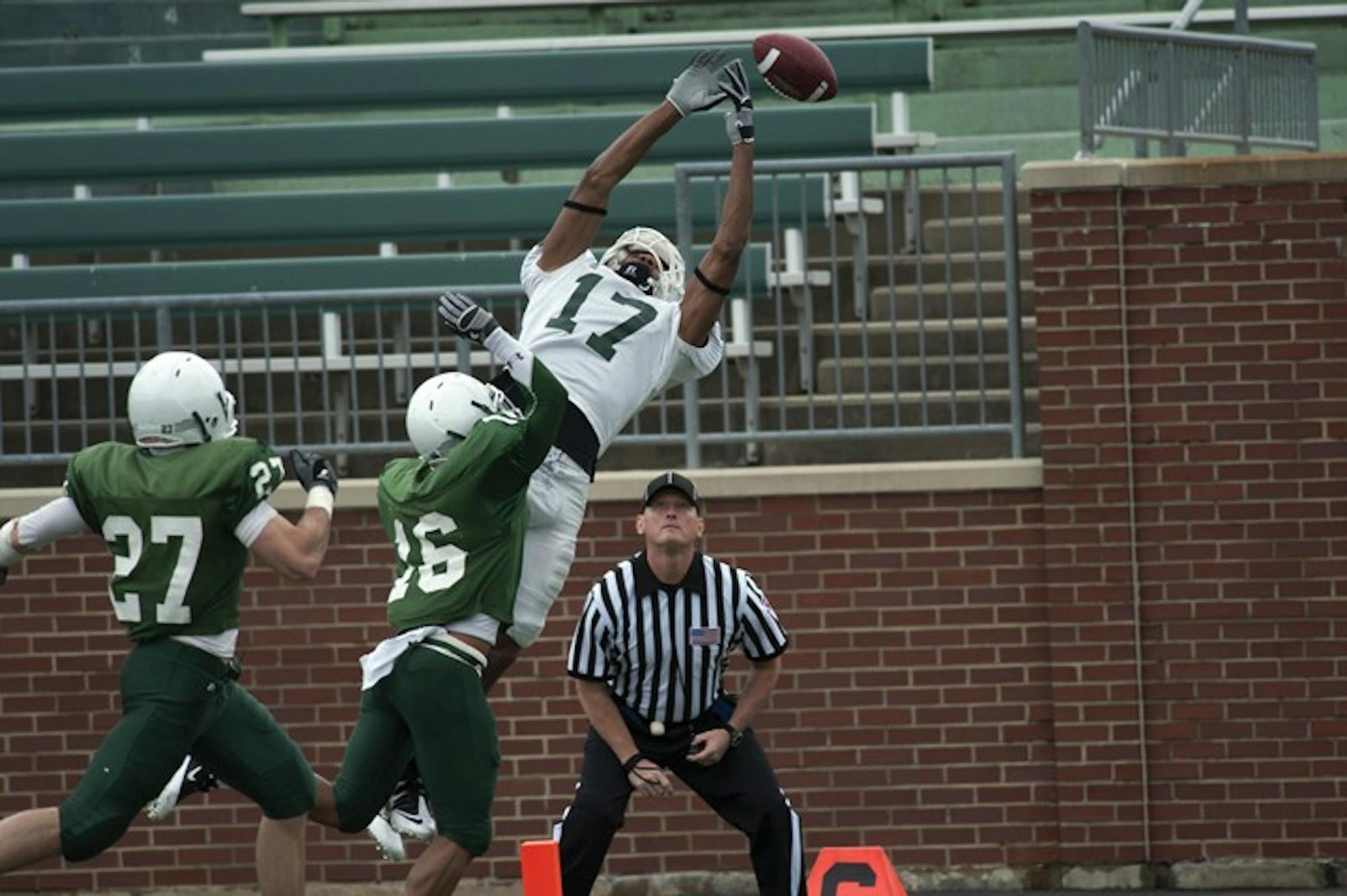 Both quarterbacks threw errant passes, but receivers’ inability to corral the pigskin led to more incompletions. Neither quarterback threw an interception or fumbled, but the green unit nearly picked off a pair of passes.