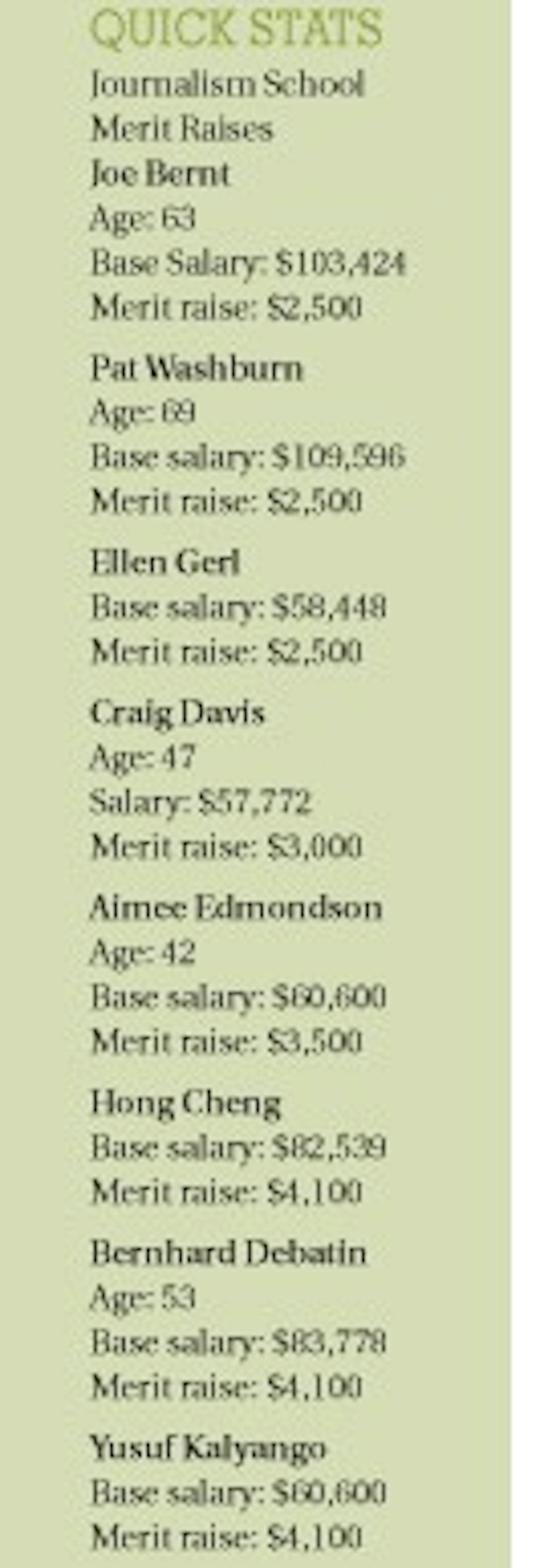 The other six journalism professors who received raises — Ellen Gerl, Hong Cheng, Bernhard Debatin, Yusuf Kalyango, Aimee Edmondson and Craig Davis — are all younger than Bernt and Washburn. Their raises ranged from $2,500 to $4,100. Their salaries before the raises ranged from $57,772 to $83,778.