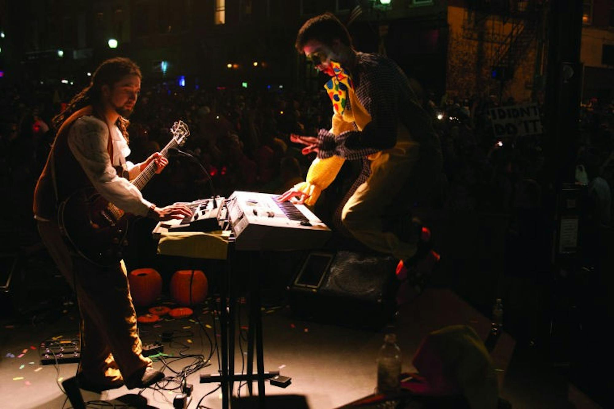Dan Perez and Mike Brokamp of Elemental Groove Theory perform at the Halloween Block Pary last year on Court Street. The outdoor party draws thousands of visitors each year and contributed to Athens' recent designation as a top college town. (Maddie Meyer | FILE)