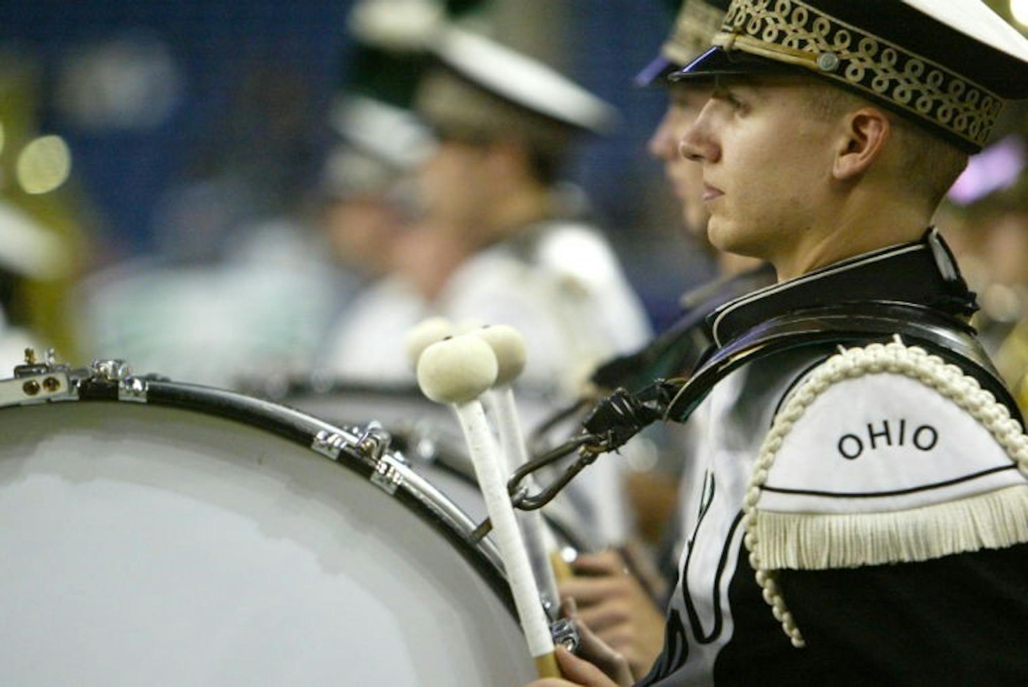 A member of the Marching 110 drumline stands at attention during the band's halftime show at Ford Field Friday.