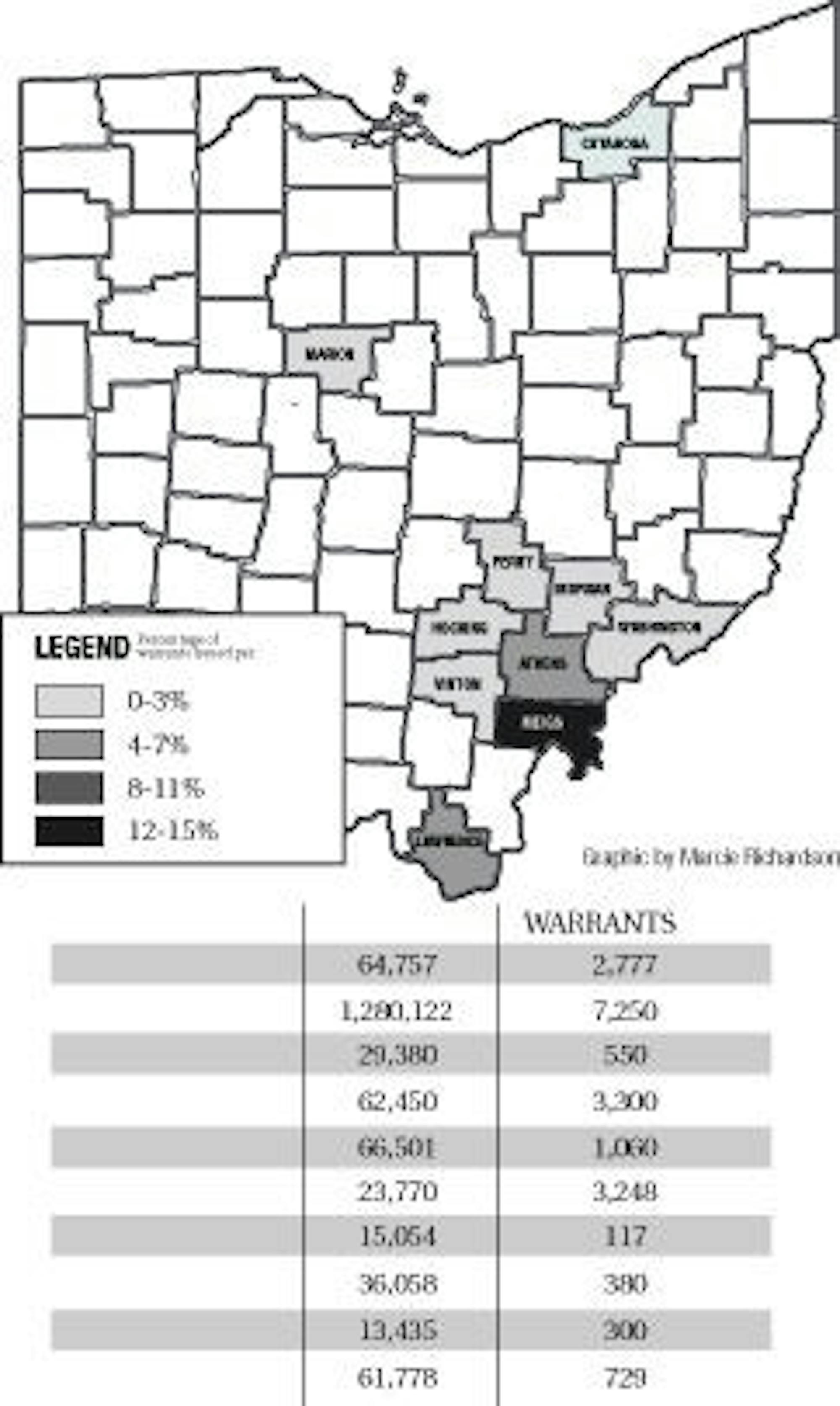 Athens ranks third-highest in warrants per capita — with one warrant for every 23.3 people — compared to nine other Ohio counties.
