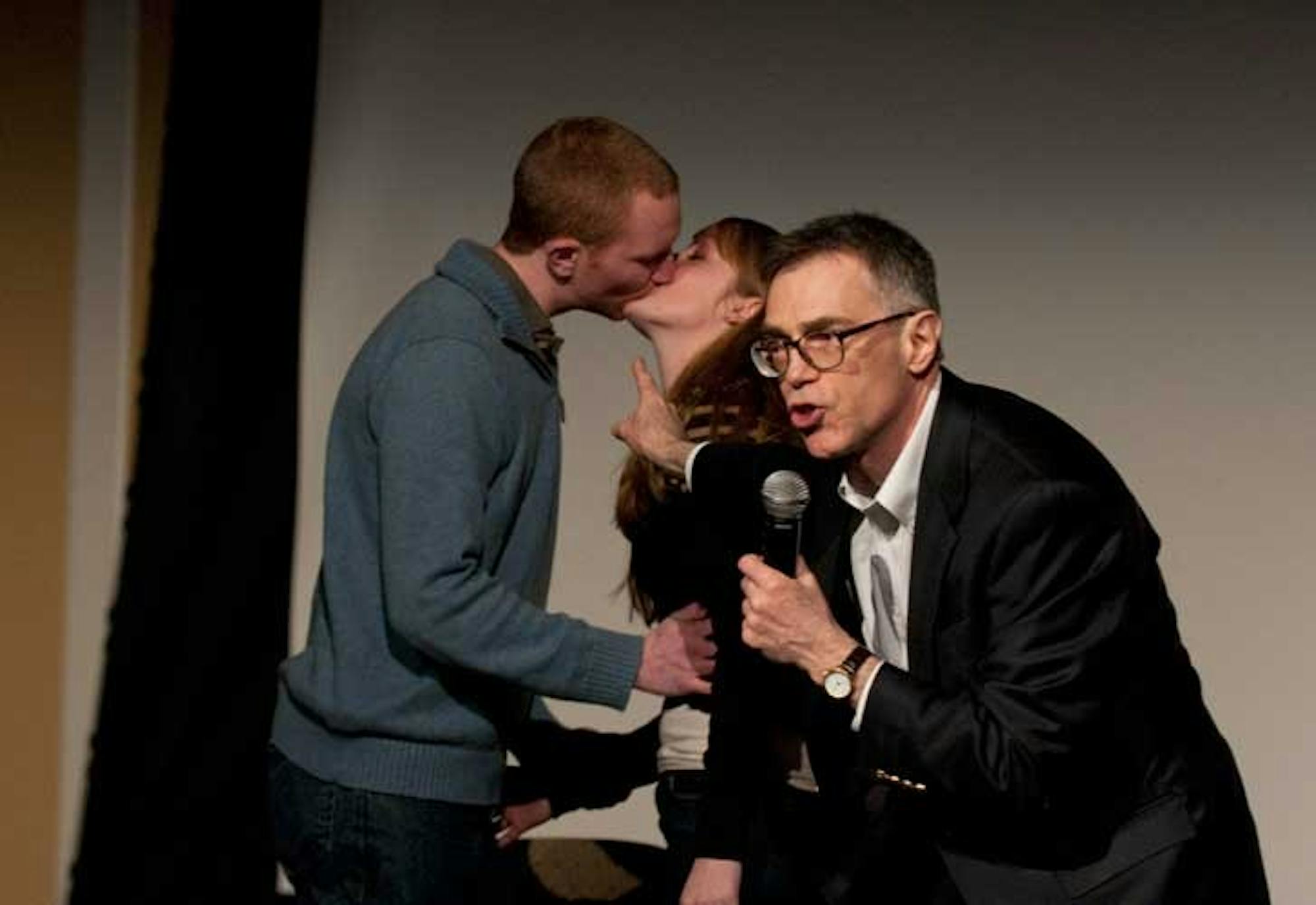 Michael Christian, under his pen name William Cane, talks about the art of kissing while Greg Tropf and Mallorie Jones demonstrate. (Gwen Titley | Picture Editor)