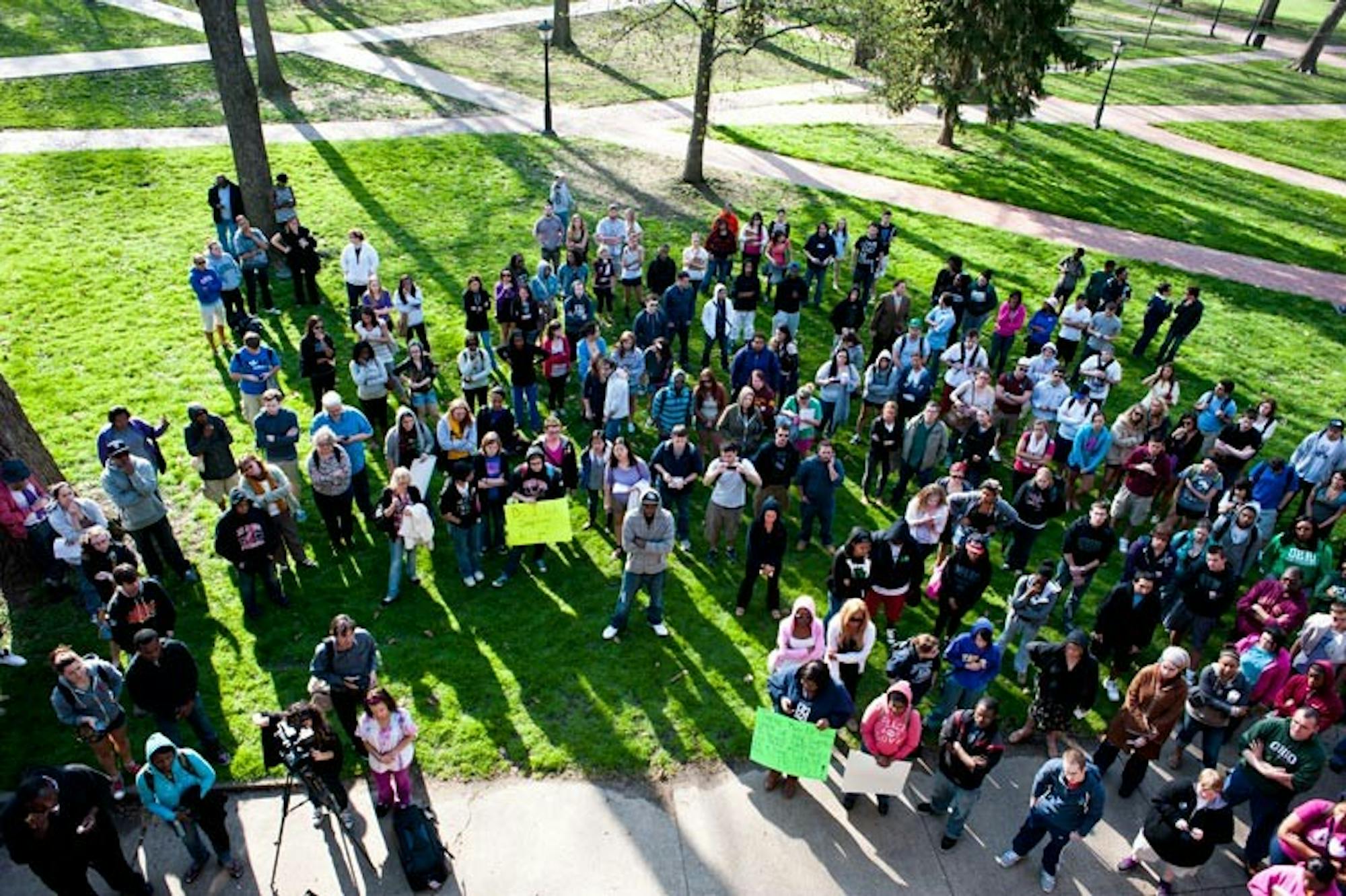 Students, faculty and members of the community gather on College Green OU for the Rally of Justice run by OU in Hoodies group in honor of Trayvon Martin. The rally started at 5 p.m. on College Green while participants of the rally listened to speakers and walked from College Green to the graffiti wall near Baker University Center. (Samantha Owens | Staff Photographer)