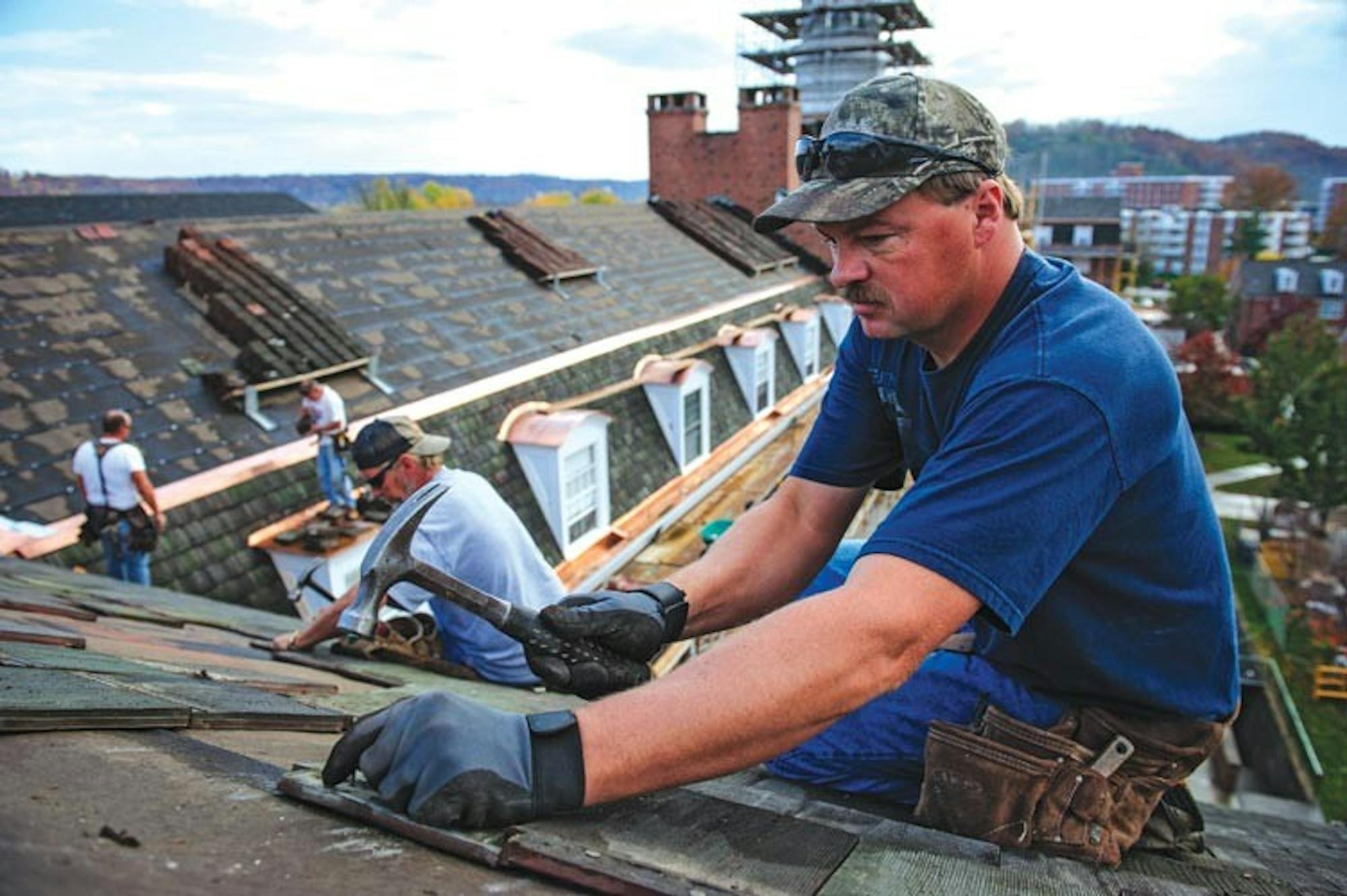 (From left) Jay Spindle, Craig Nelson, Allen Nelson and Mark Barber work on the roof of Jefferson Hall on East Green. Students affected by the construction can choose only to apply for a room change and receive no monetary compensation for the disturbance, but OSU students can receive financial compensation. (Brien Vincent | Staff Photographer)