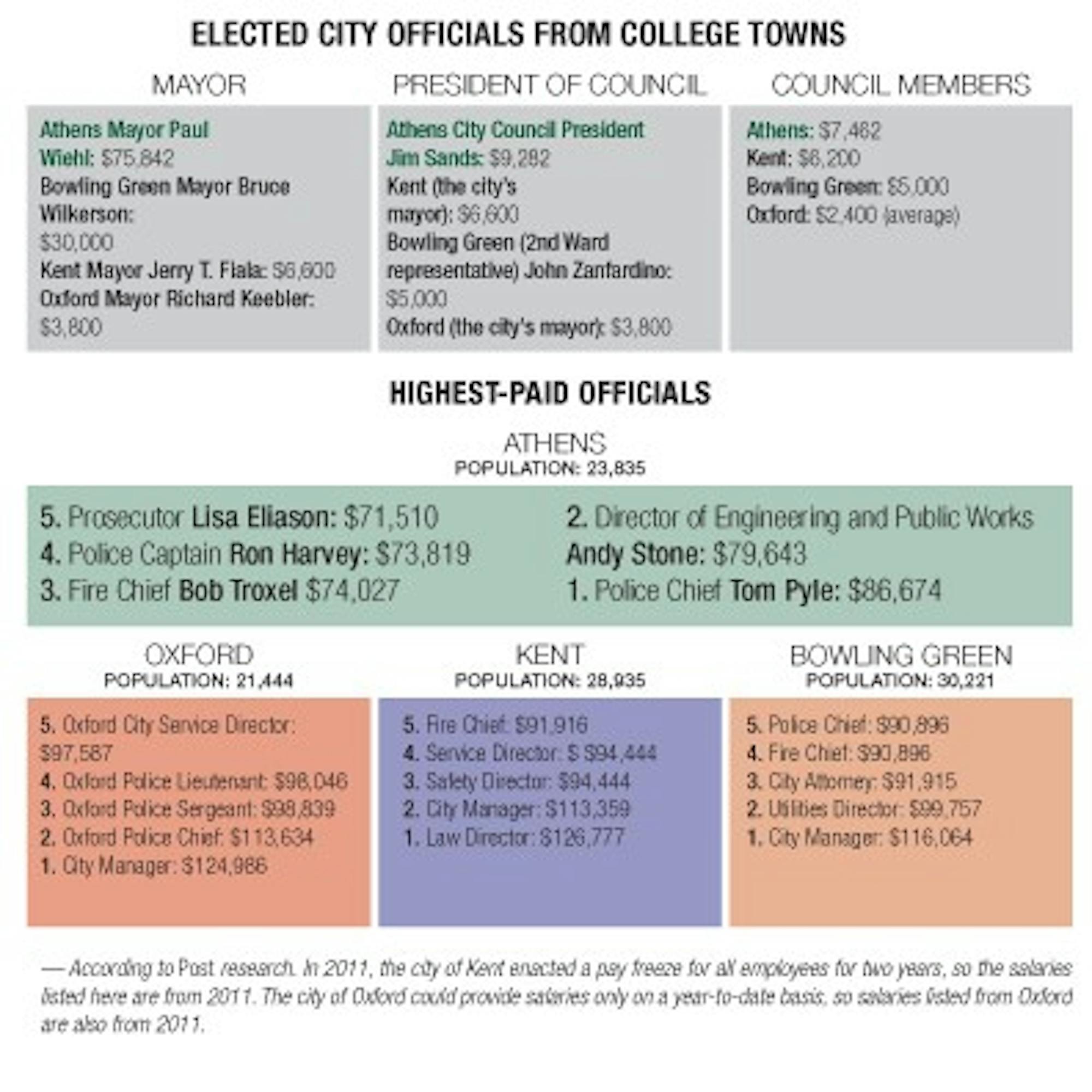 No Athens city employee has a base salary of more than $90,000, according to Post research, but the highest-paid officials from the cities of Kent, Oxford and Bowling Green make more than $100,000.