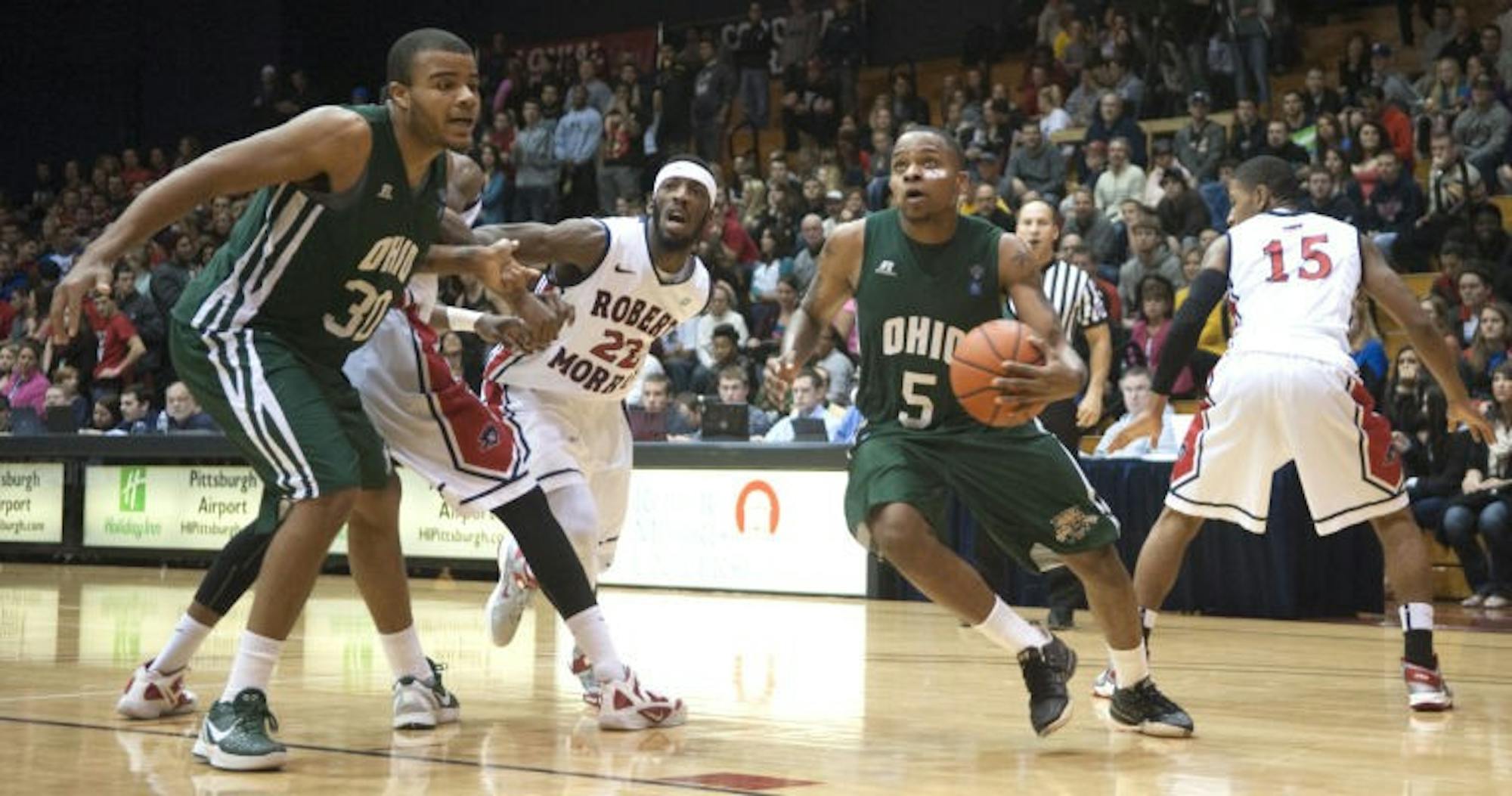 Ohio senior guard D.J. Cooper drives the hoop while senior forward Reggie Keely moves into position. Ohio lost to Robert Morris on Dec. 1. (Dan Kubus | Staff Photographer)