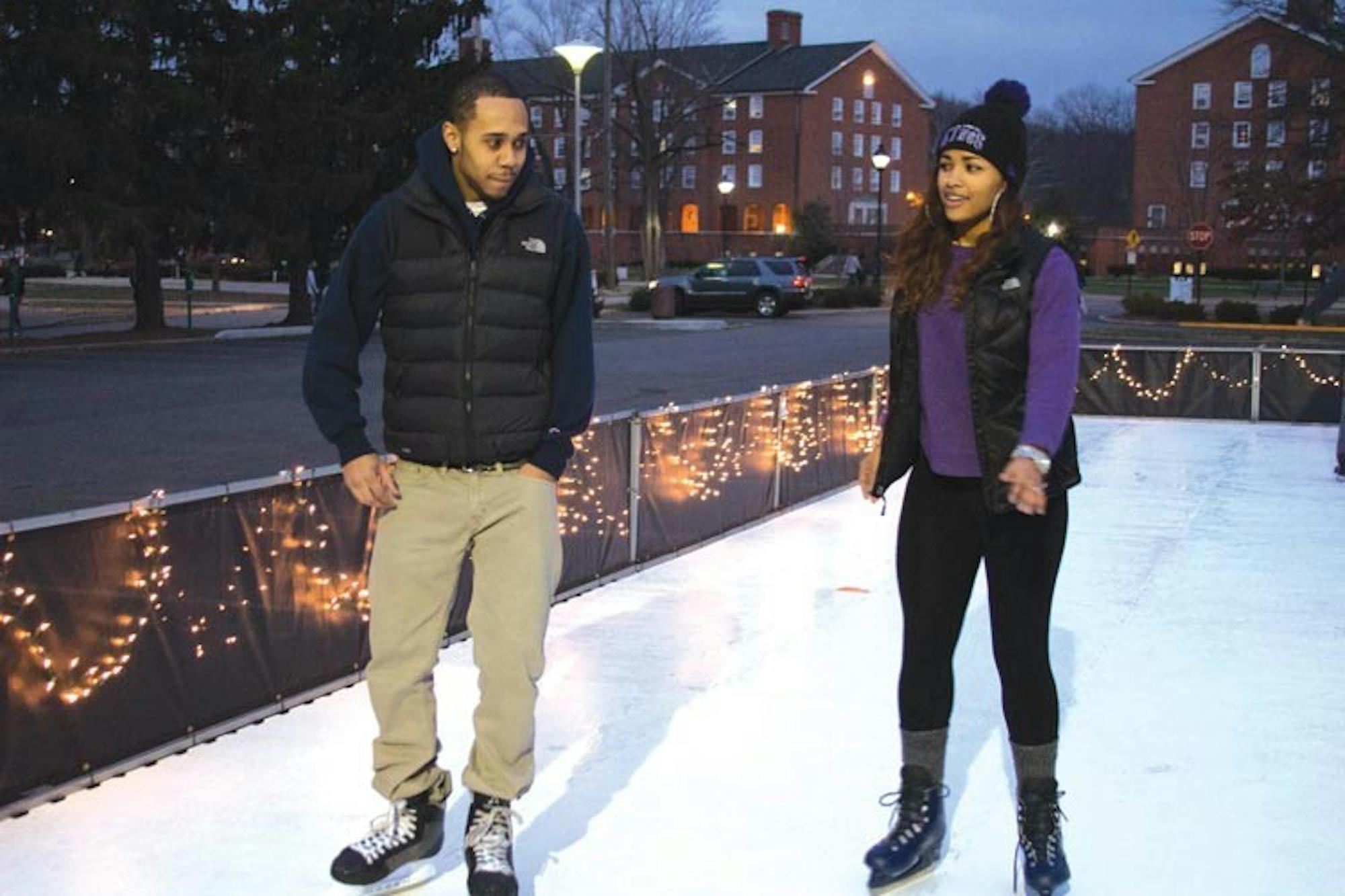 Ohio University seniors Owen Patterson and Lauren Somerville skate on the ice rink in the parking lot of Morton Hall. (Julia Leiby | For The Post)