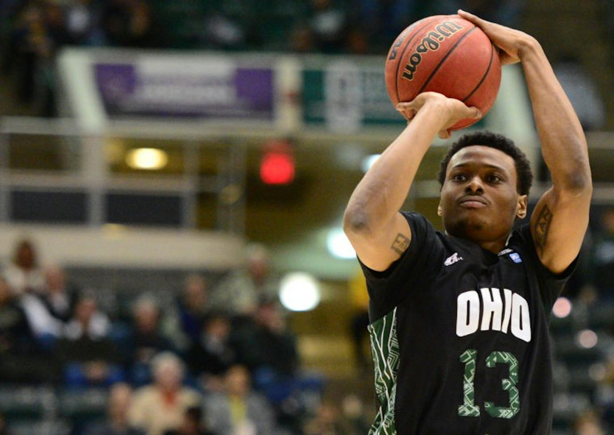 Ohio junior forward T.J. Hall puts up a free throw against Northern Illinois. The Bobcats won handily against the Huskies on Jan. 16 to move to 3-0 in Mid-American Conference play. (Jason Chow | Staff Photographer)