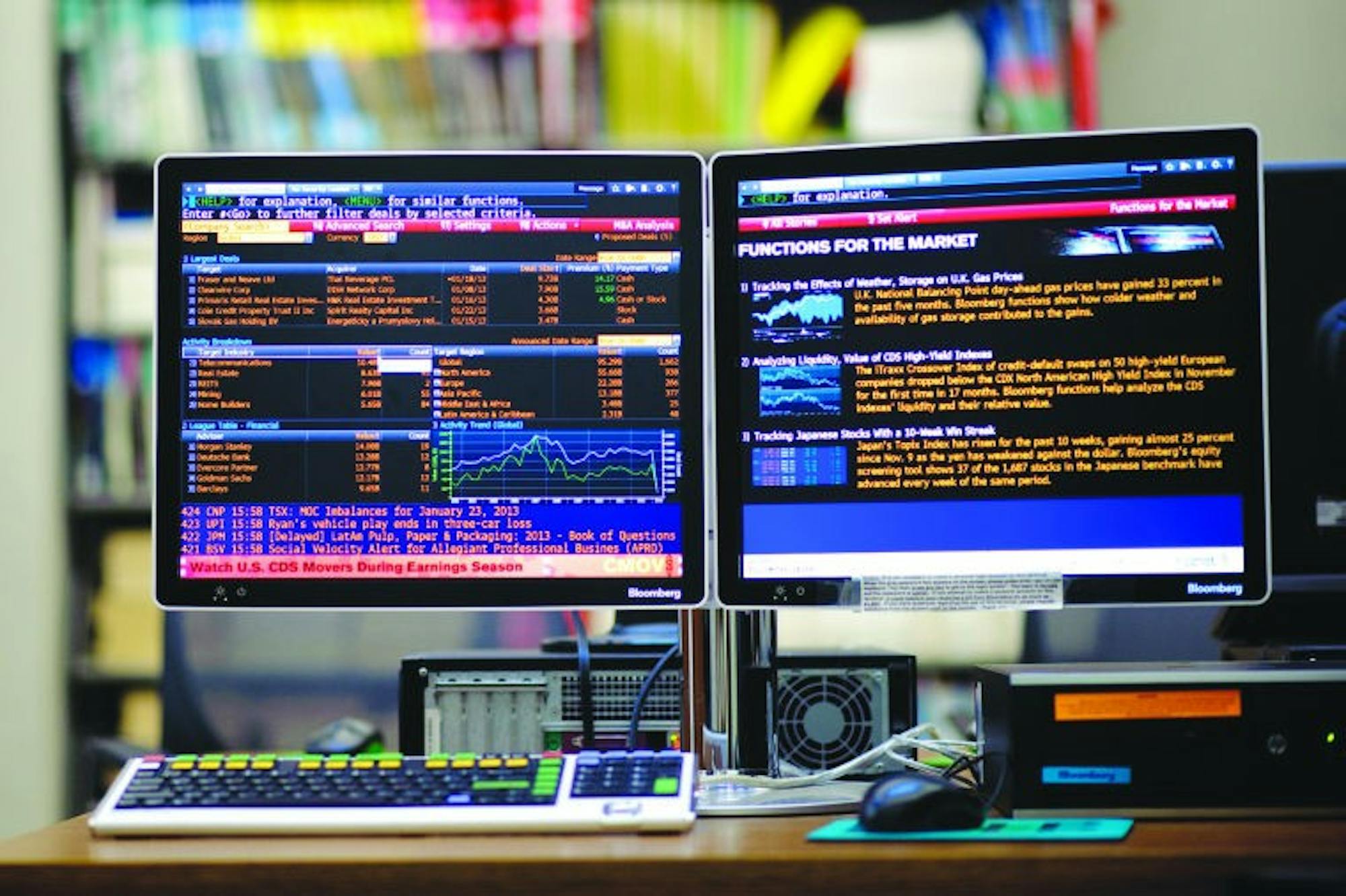 The computer has dual monitors and a specialized keyboard programmed to execute common actions to easily access news and equity information.