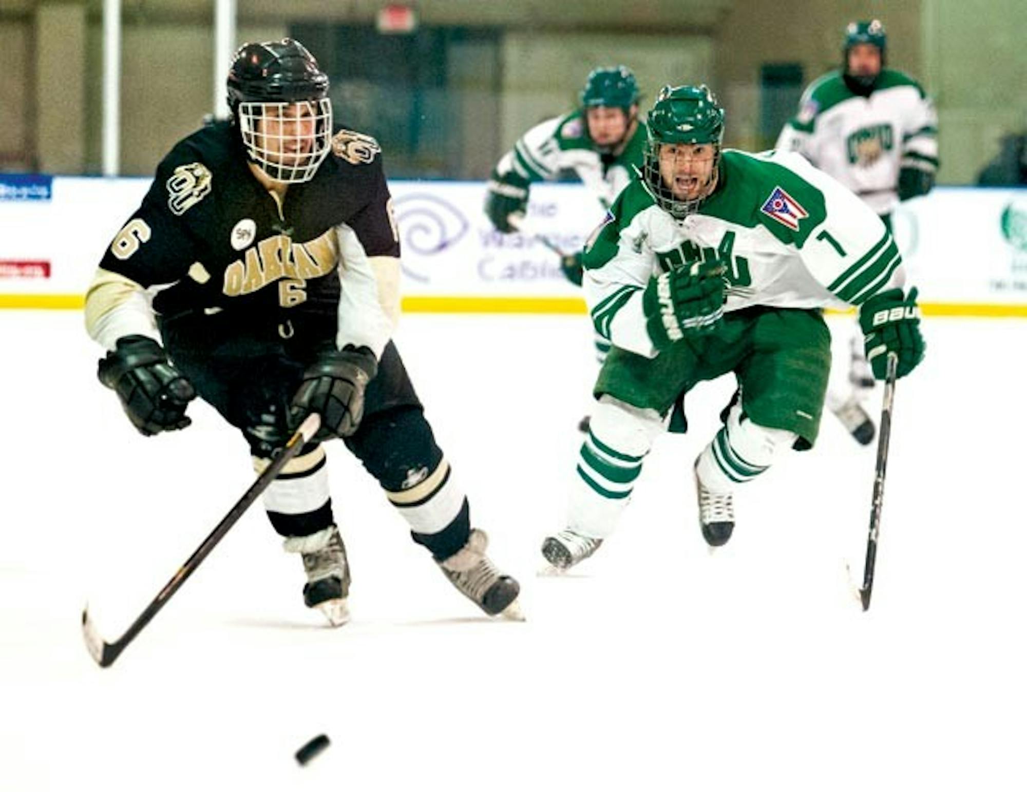 Oakland defender Mike Baker and Ohio forward Jonathan Pietramala chase the puck as the Bobcats defeat the Grizzles. Ohio won against Oakland with a score of 4-3 in Bird Arena on Jan. 25. (Daniel Kubus | Staff Photographer)