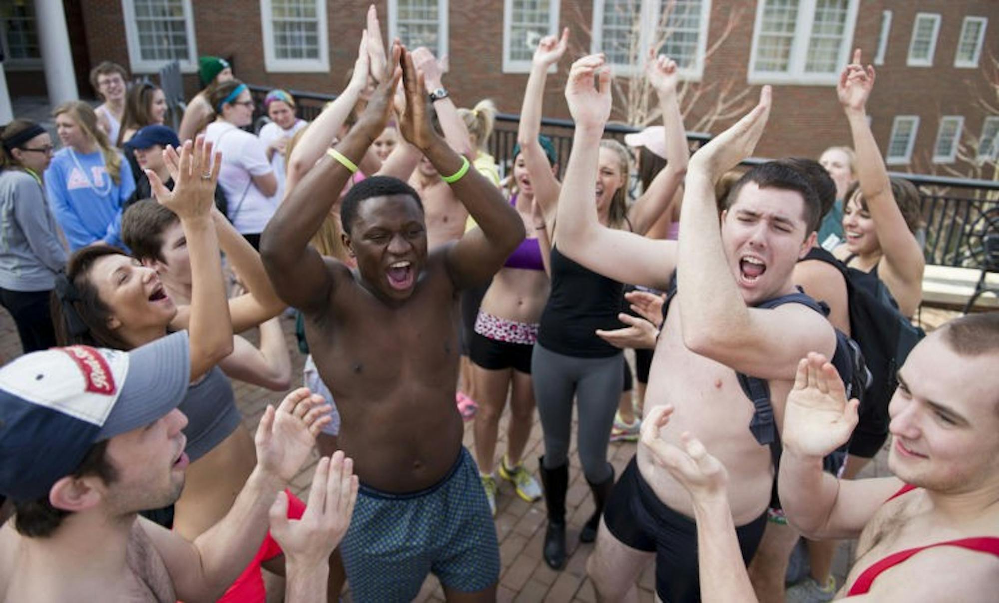 Participants run downCourt Street during the Fourth Annual Bare on the Bricks. Students stripped down for the charity run Saturday afternoon.