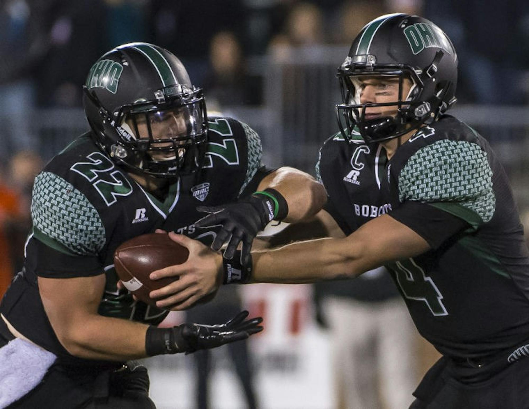 Ohio running back Beau Blankenship receives a handoff from quarterback Tyler Tettleton against Bowling Green on November 7, 2012. The Bobcats lost the game 26-14. (Jason E. Chow | Staff Photographer)