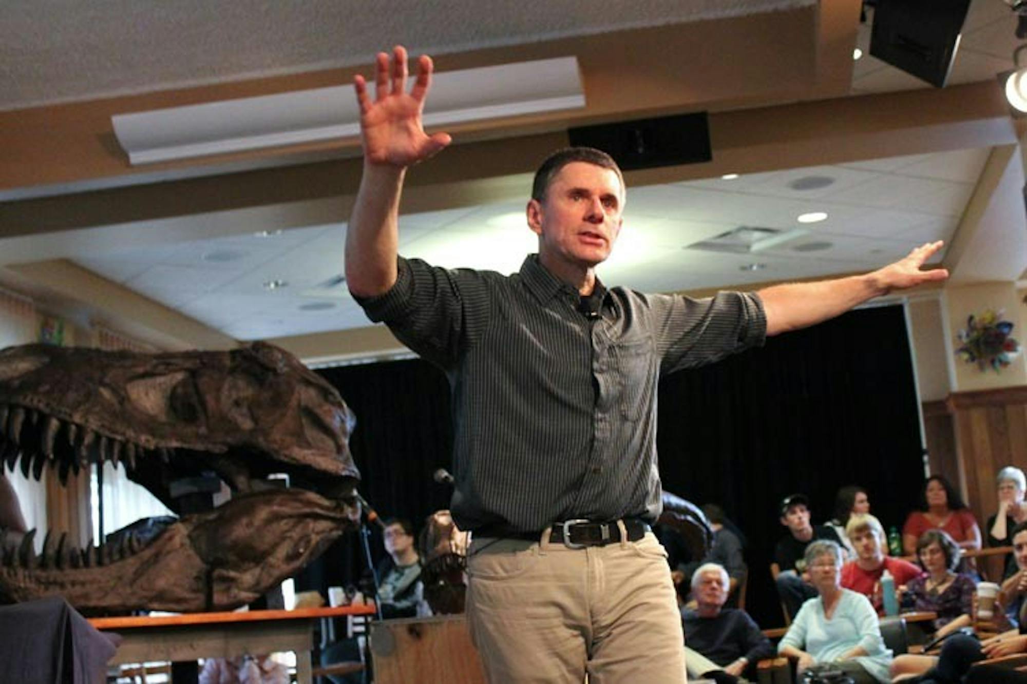 The room was filled to capacity with more than 100 people listening to Lawrence Witmer, an Ohio University anatomy professor and dinosaur expert, talk about how technology aided in researching dinosaurs — the “terrible lizards.”
