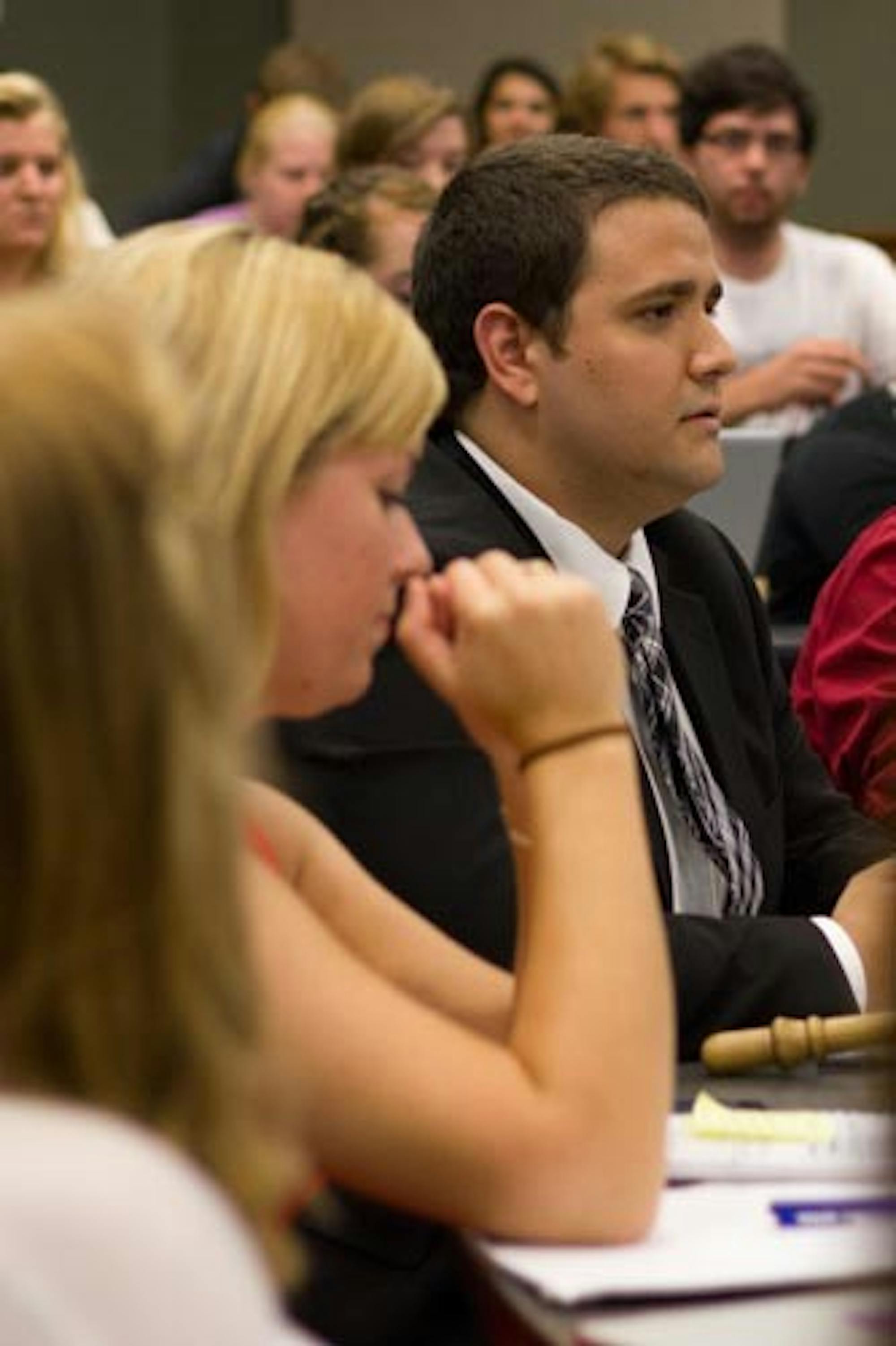 In front of an audience sporting finely pressed suits, a student in a wrinkled blue dress began condemning the Student Senate president’s social media etiquette and the sexist culture she said it represented.