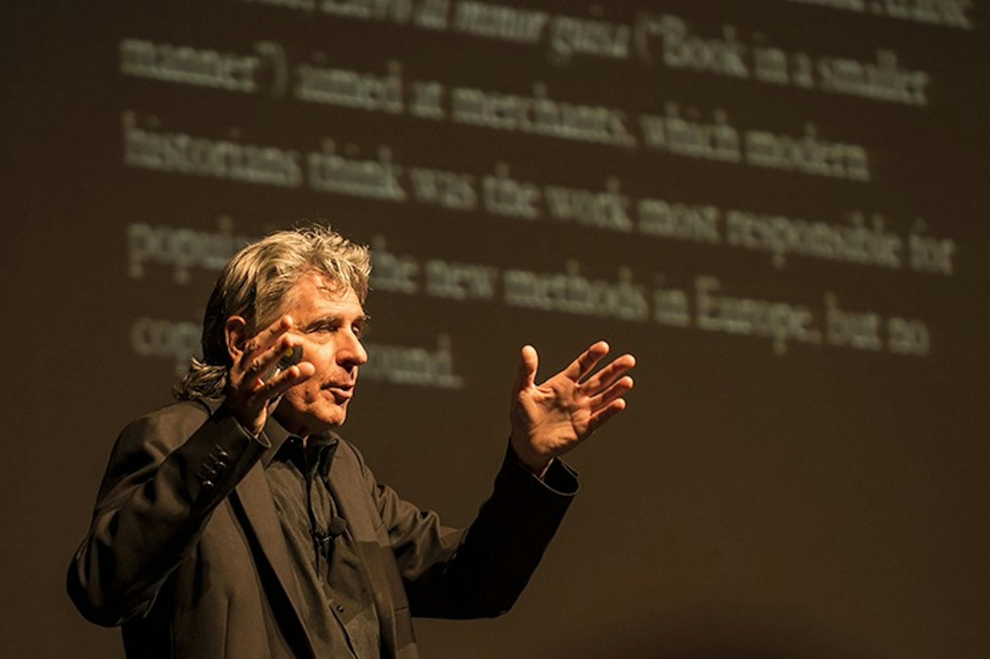 Keith Devlin, a professor of mathematics at Stanford University, spoke at Templeton-Blackburn Alumni Memorial Auditorium Tuesday night about his research regarding the similarities of two personal computing revolutions: Leonardo Fibonacci’s teaching of the number system and the invention of the personal computer.
