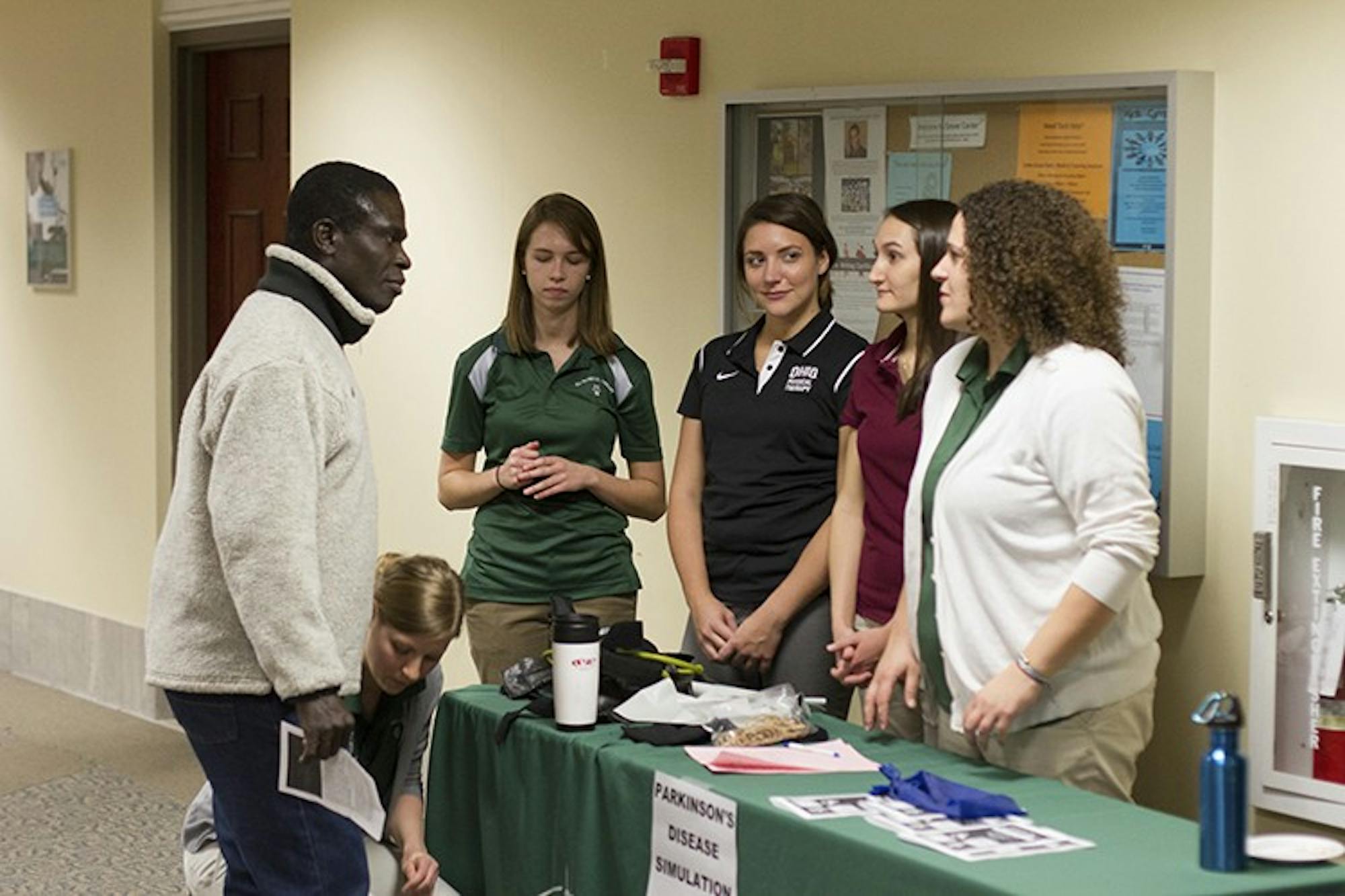 “If you have never ridden in a wheelchair, and you therefore don’t know what it is like for someone who uses a wheelchair on a daily basis, you get the chance to move around parts campus and get an idea of what that is like,” said Henry Boachi, a graduate student studying communication development studies. “Or you can simulate Parkinson’s disease with these bands we have for the feet and the arms. They sort of impair movement so you have just a feel of it.”