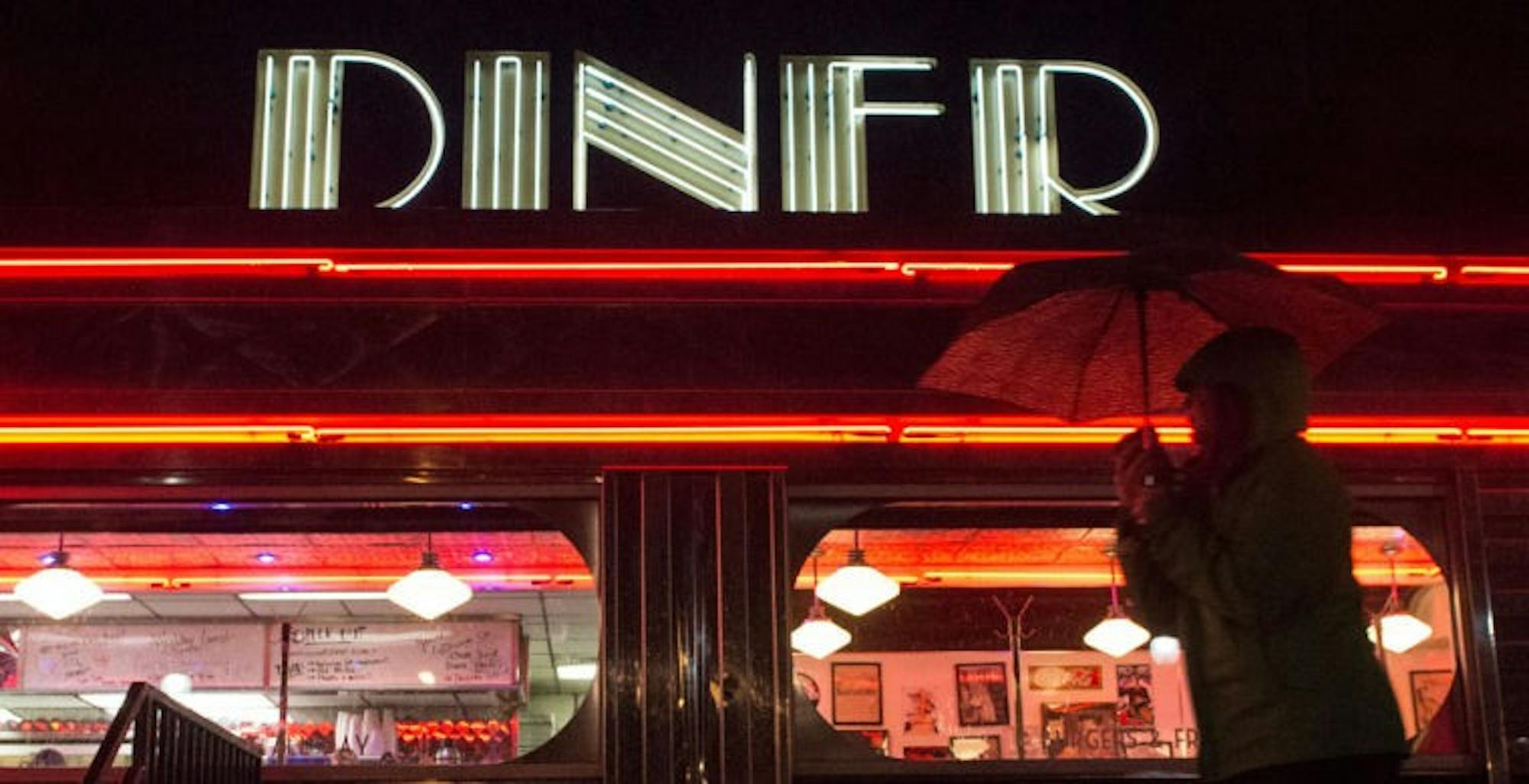 Hannah Nelson stays dry under the cover of her umbrella as she walks past a lit up Court Street Diner in rainy weather at night. (Isaac Hale | Staff Photographer)