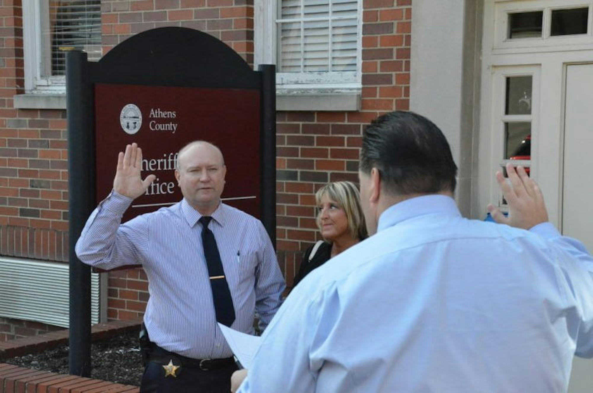 Standing in front of sign that once read "Pat Kelly, Sheriff," Rodney Smith was sworn in as Athens County's Interim Replacement Sheriff.