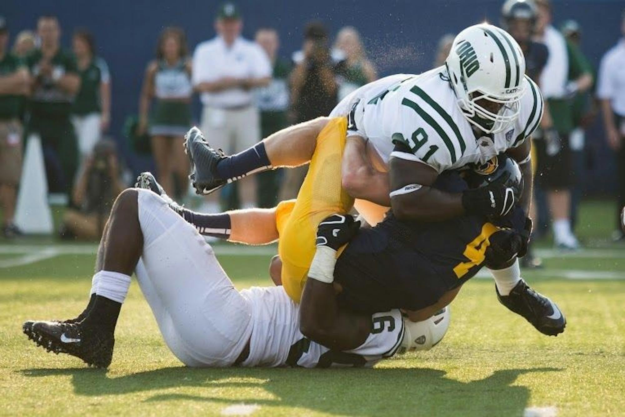 Ohio defensive lineman Antwan Crutcher tackles a Kent State player last week.