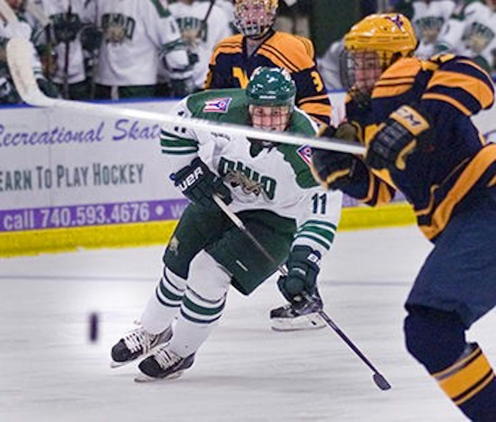Three Ohio players scored in the final period, as Joe Breslin, Patrick Spellacy and Paul Sergi each added a goal.