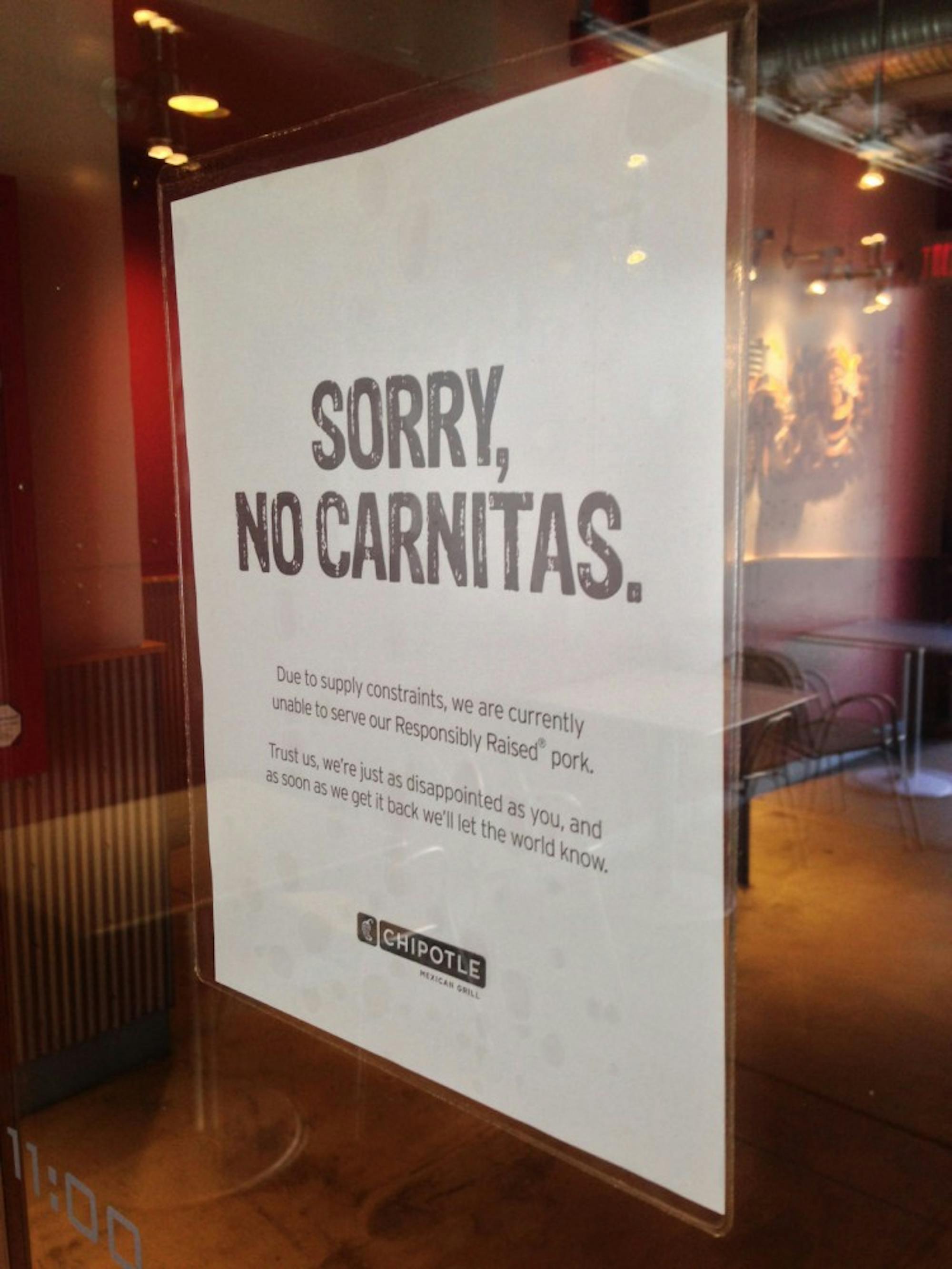 A sign reading “Sorry, no carnitas” hanging on the restaurant's Court Street entrance is one of many appearing nationwide following a disagreement with one of the company’s pork suppliers.