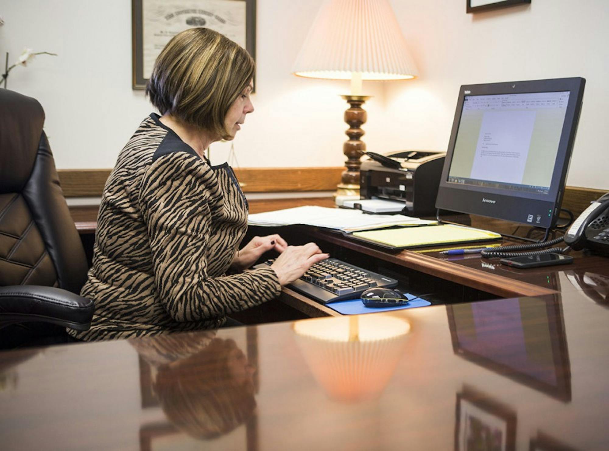 Athens City Law Director Lisa Eliason works in her office in the Athens City building on E. Washington Street on March 18, 2015. Eliason is the first woman to ever occupy this position in Athens.