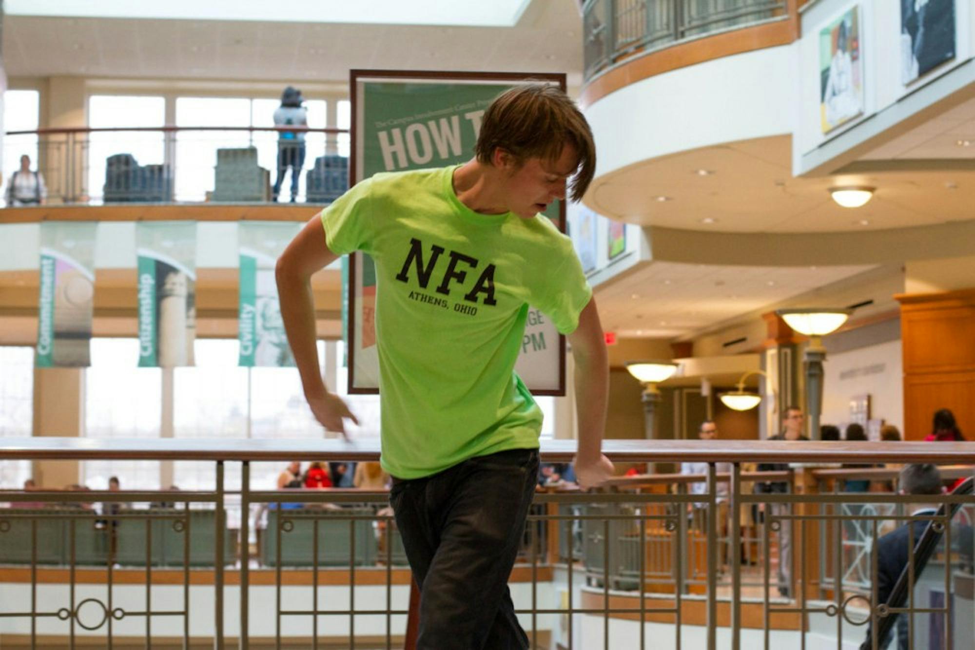 Zac Oberg, a senior studying games and animation, dances at the top of Baker University Center. Oberg is helping with a speech and debate conference held at Ohio University, and decided to liven up his duties by dancing his way through them.