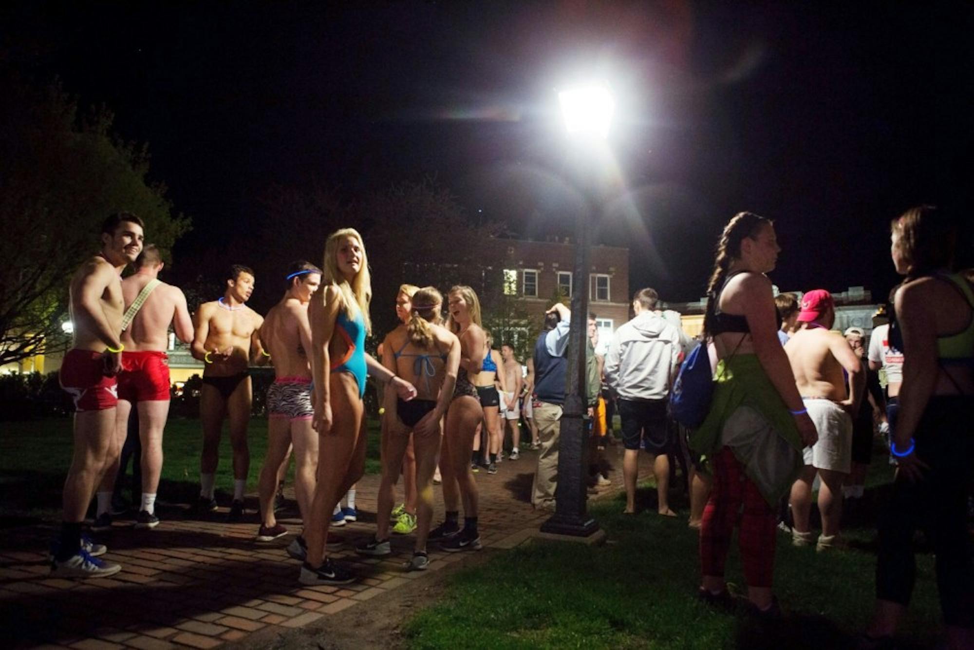 Bare on the Bricks participants congregate near College Gate on College Green after the run Thursday night. The annual event involves students shedding their top layers and donating those clothes to charity and is organized by the Student Alumni Board.