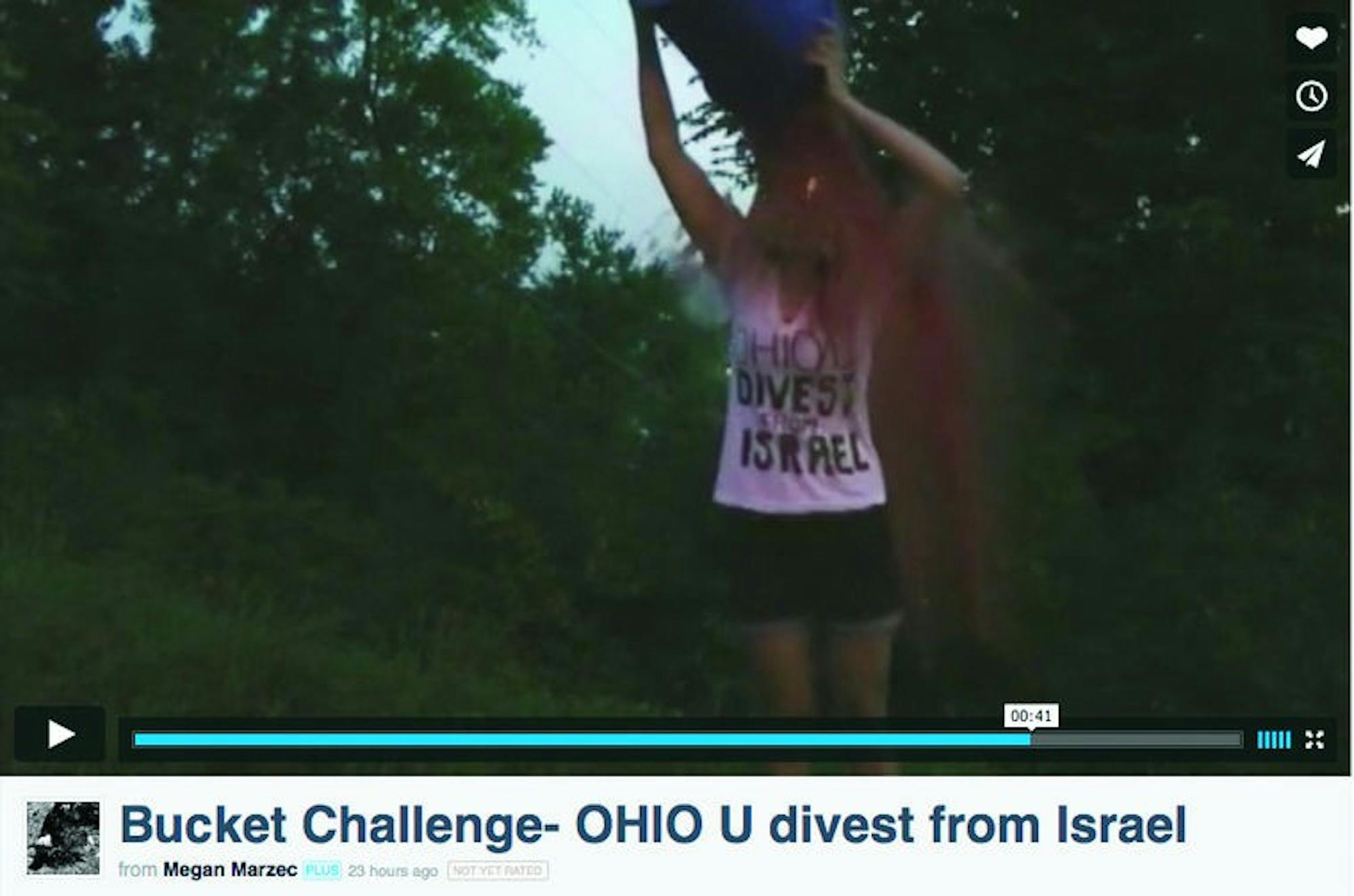 The controversy arose after Ohio University Student Senate President Megan Marzec poured fake “blood” on herself in a video demonstrating concern for the Israeli-Palestinian conflict. The video, where Marzec urged the university cut its ties with Israel, was in response to OU President Roderick McDavis’ ALS Ice bucket challenge.