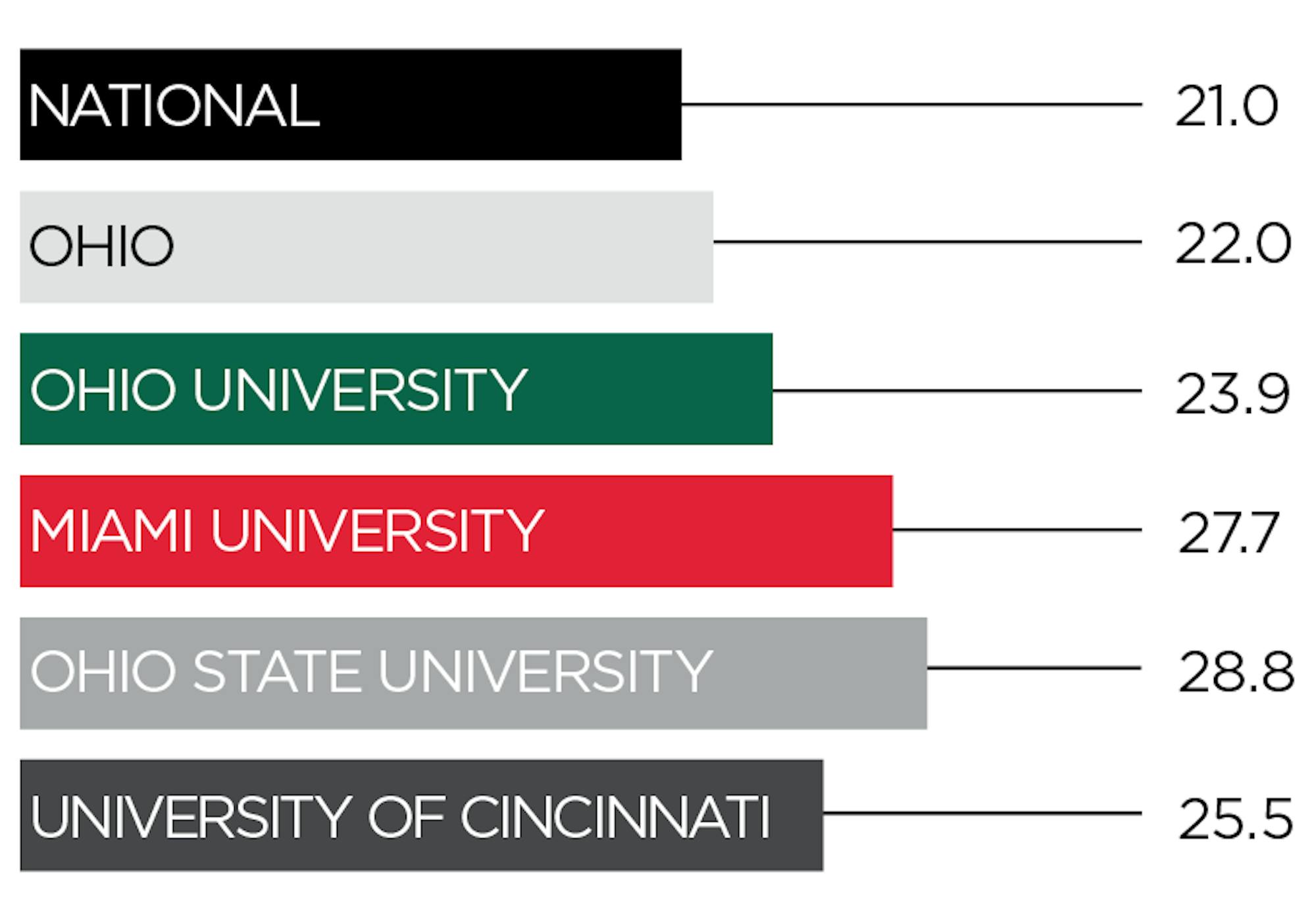 This year, Miami’s average ACT score was 28. Ohio State’s was 28.9, and Cincinnati’s was 25.7.