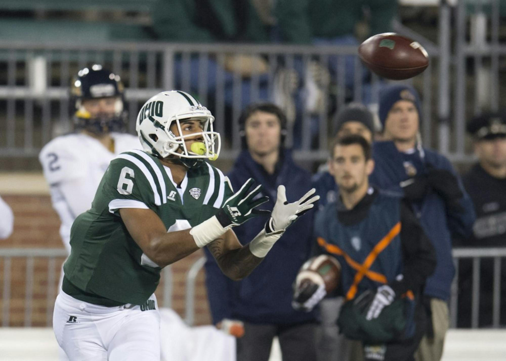 Ohio junior wide receiver Sebastian Smith hauls in a touchdown reception on the first drive of the game against Kent State. Smith was recently named to the third team All-MAC offense.