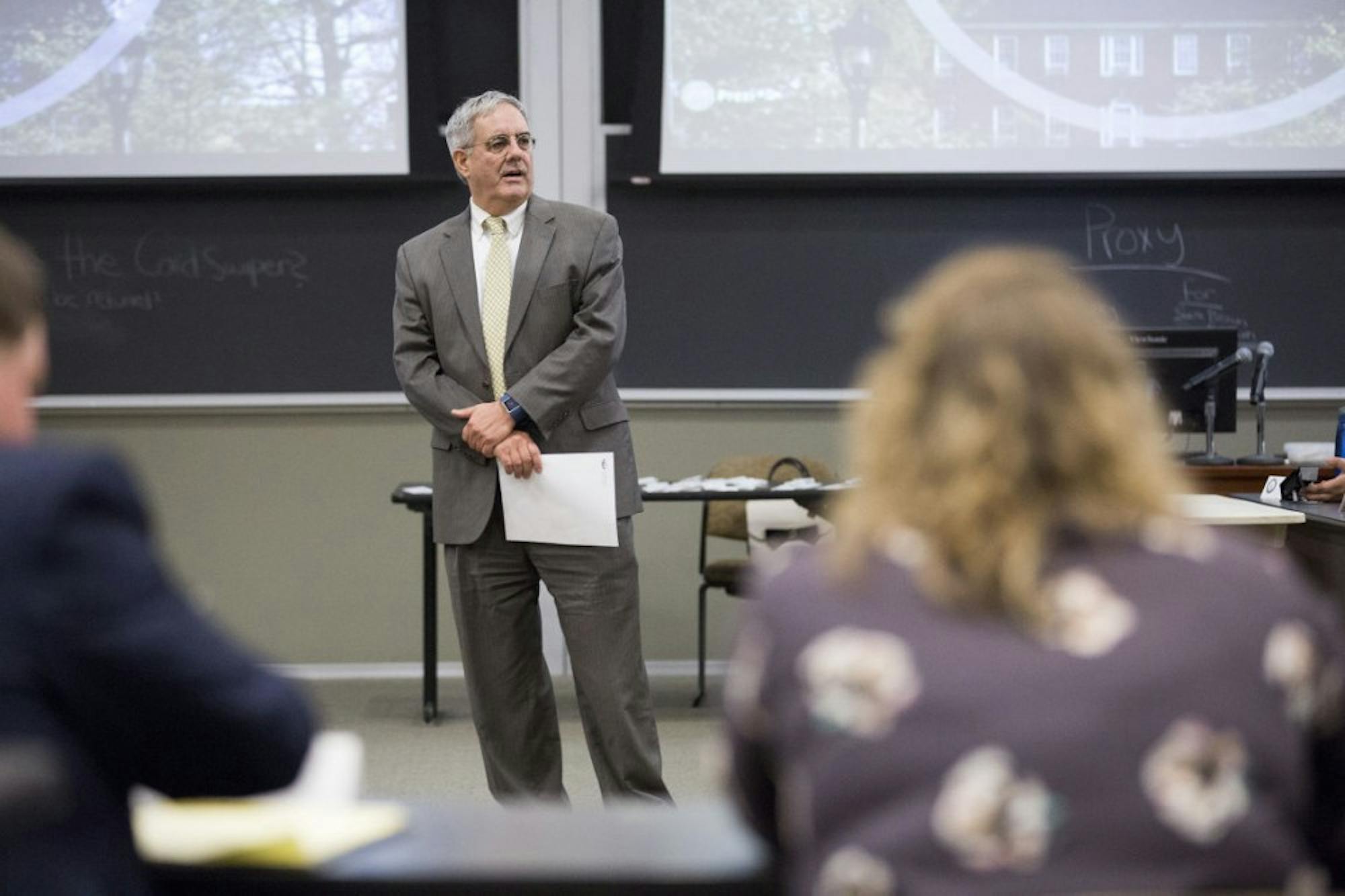 Joe Lalley, senior associate vice president of Information Technologies and Administrative Services, explains the timeline and the need for the construction to College Green's Class Gateway during a weekly student senate meeting in Walter Hall on March 23.