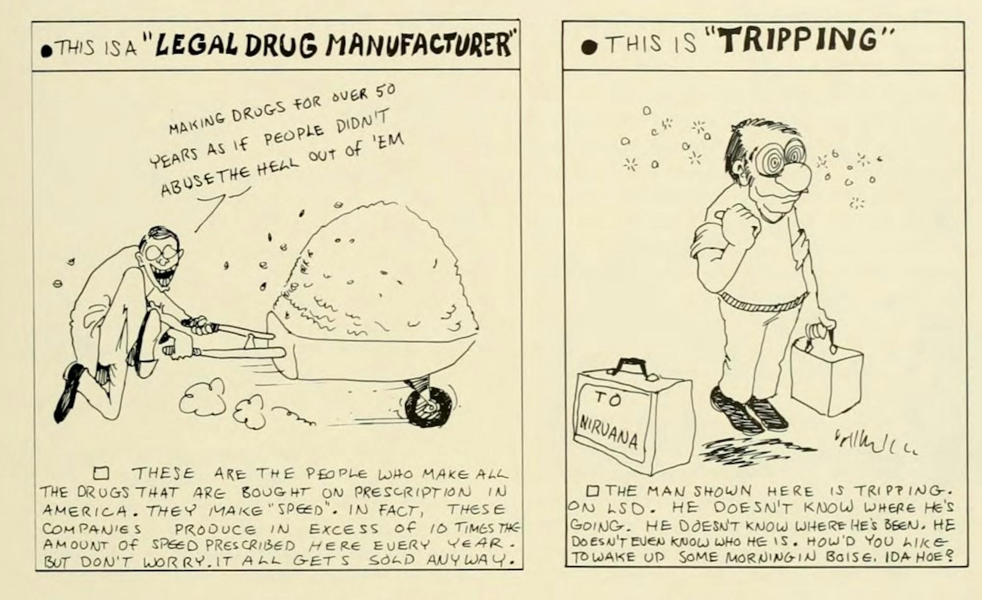 Cartoons depicting a legal drug manufacturer and a man tripping on LSD appeared in the 1970 Athena Yearbook alongside a story detailing campus drug culture. (Provided via The Mahn Center for Archives and Special Collections)