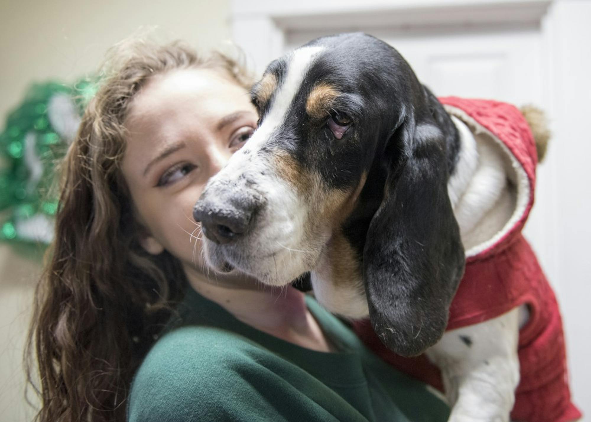 Fran, an eight year old basset hound, can usually be found slowly strolling up and down High St. wearing the newest addition to her cold-weather holiday season wardrobe — a warm fleece lined sweater with a pom-pom topped hood.