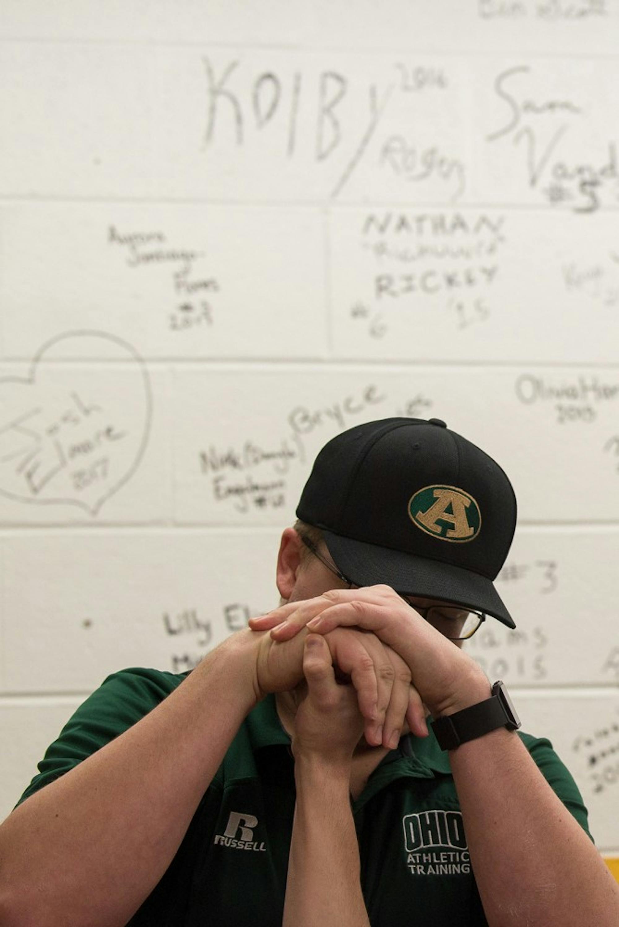 Mitch McKay, the Athens High School Head Athletic Trainer and second year graduate student in the athletic training program, works with Athens High School swimmer Nathan Hawes, to relieve the shoulder pain and tightness that Hawes has been experiencing. On the wall behind them are the signatures of athletes and athletic trainers who have come before them. (EMMA HOWELLS | PHOTO EDITOR)