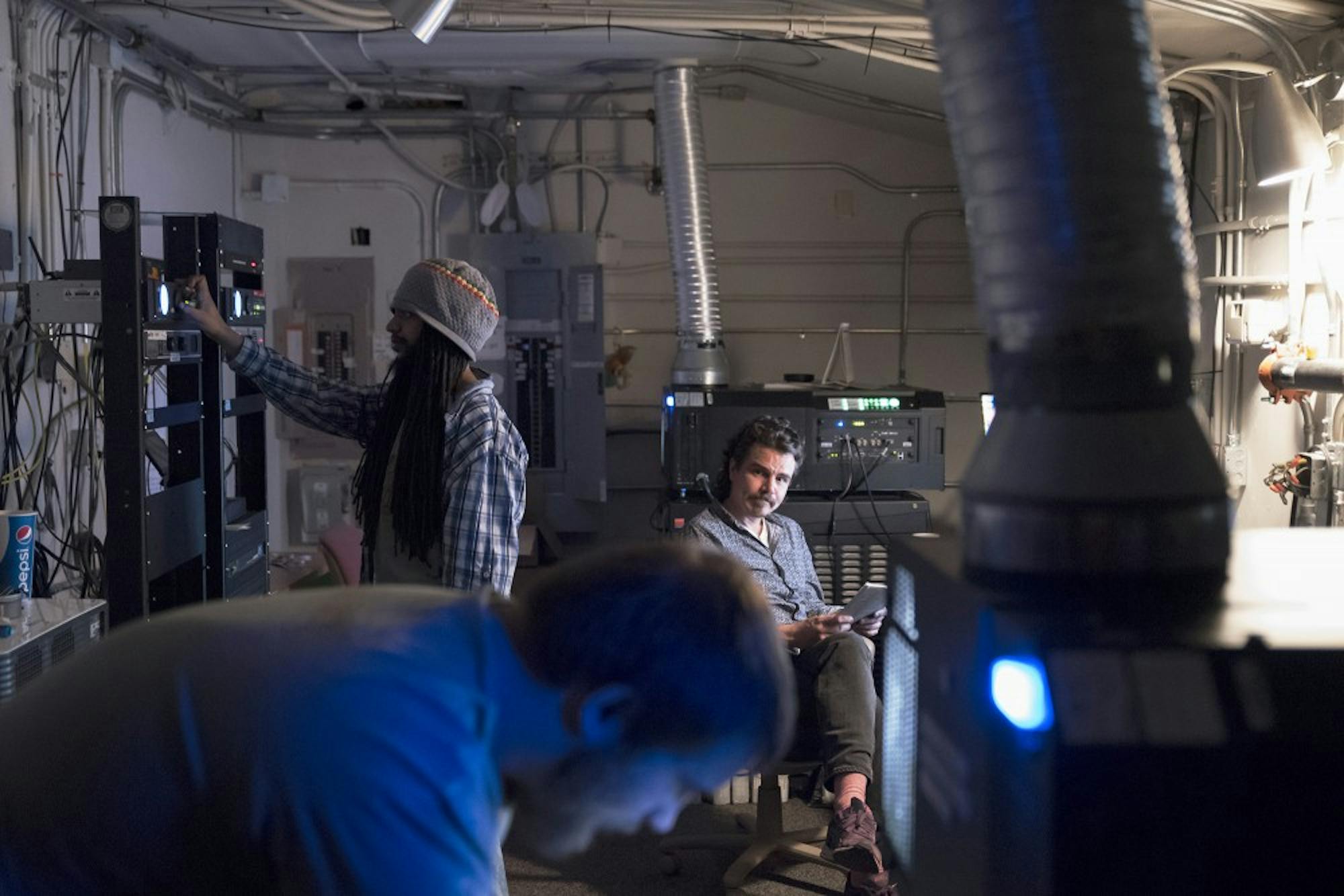 Three people sit in the warm projection booth of The Athena Cinema, checking the sound levels and the projection of a film being screened at the Athens International Film and Video Festival.