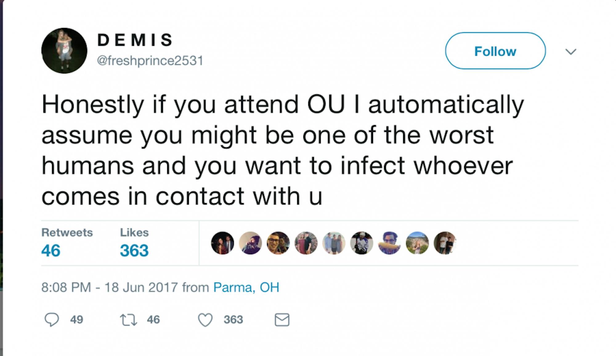 Honestly if you attend OU I automatically assume you might be one of the worst humans and you want to infect whoever comes in contact with u