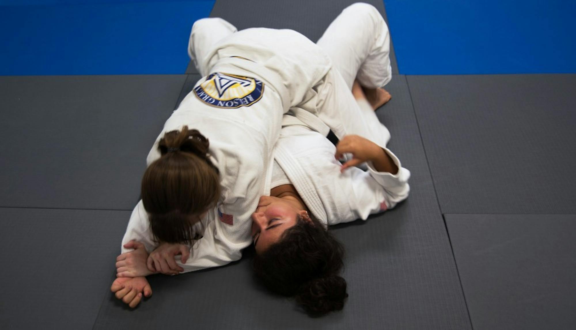 Hania Al-Azm (bottom) and Molly Armstrong partner up to paractice the escape technique at Relson Gracie jiu-jitsu academy in Athens, Ohio on Saturday, August 26, 2017 (McKinley Law | Photo Editor)