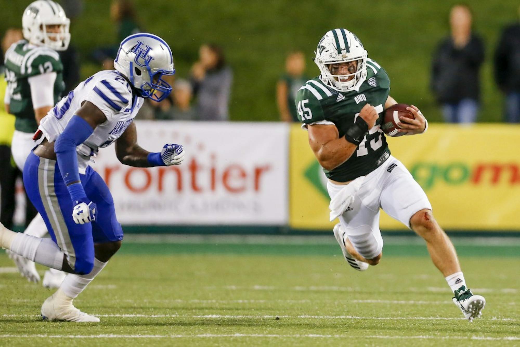 Ohio redshirt junior running back A.J. Ouellette runs downfield during the second quarter of Ohio's game against Hampton on Saturday at Peden Stadium.