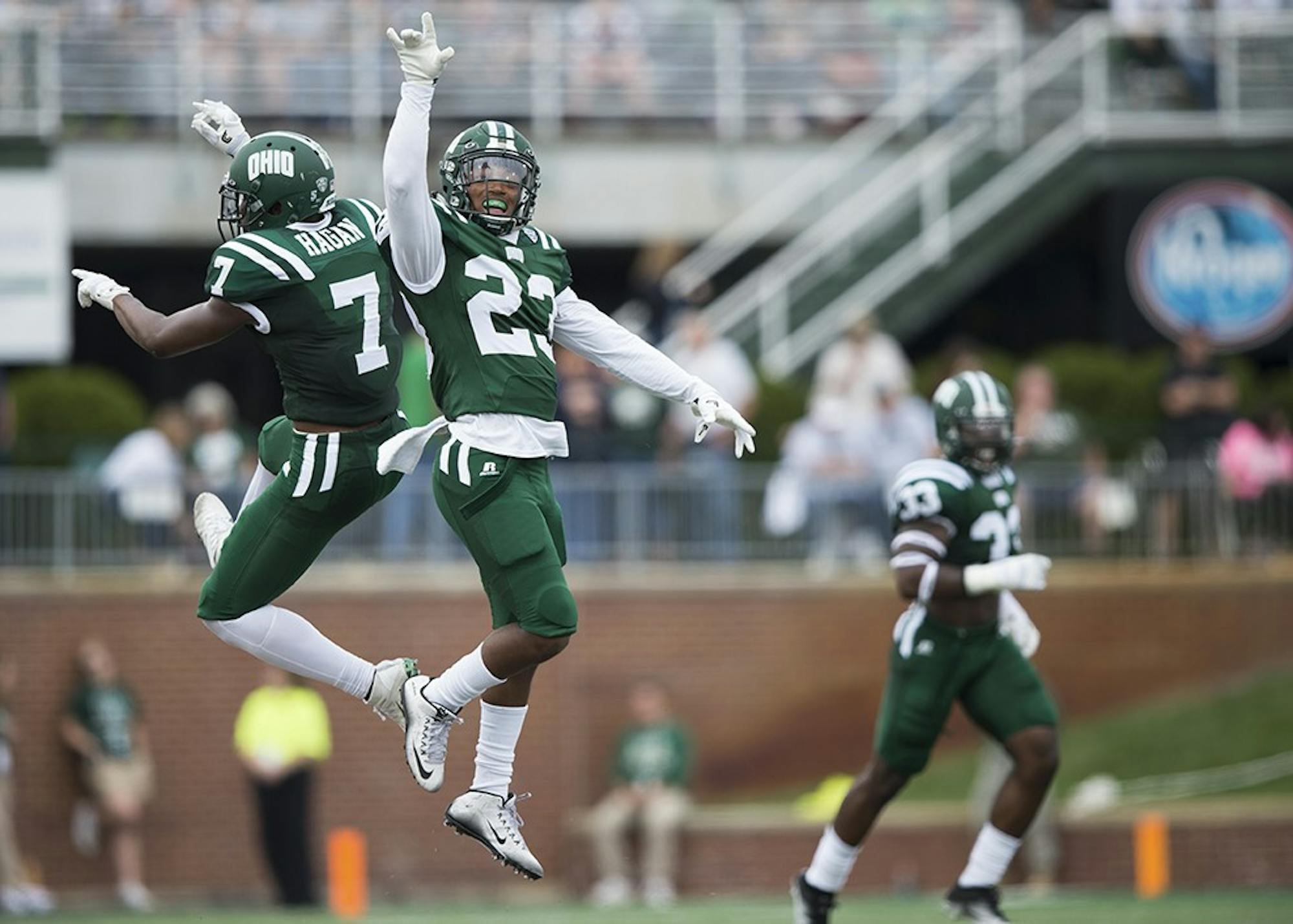 Javon Hagan (7) and Kylan Nelson (23) celebrate after making a play against Eastern Michigan in Peden Stadium on October 15, 2016. Ohio lost 27-20.