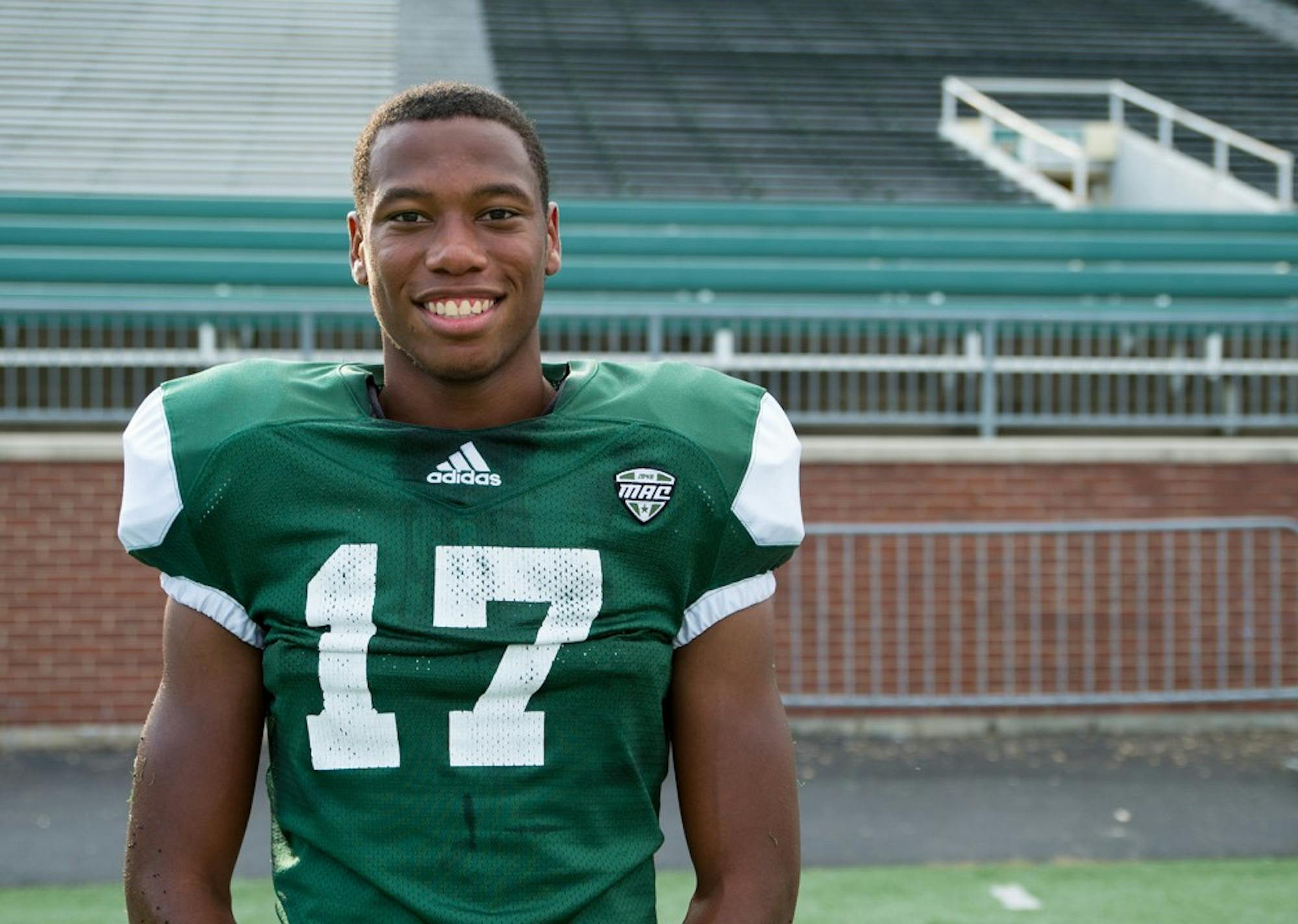 Freshman Tariq Drake poses for a portrait at Peden Stadium.