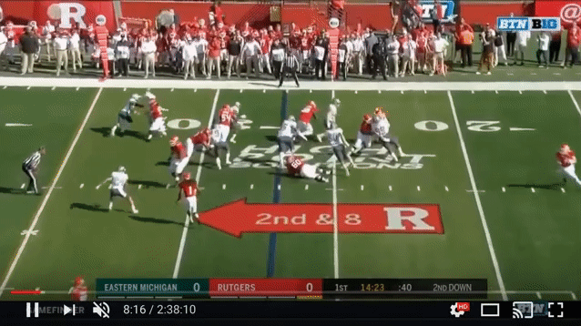Rutgers lines up in the traditional pistol offense and Eastern Michigan counters with a 4-2-5 look.
