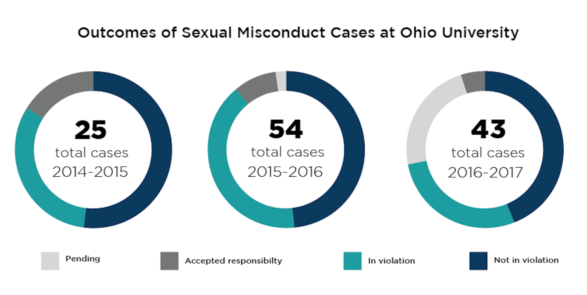 So far, 44 percent of cases submitted to the office for the 2016-17 academic year have been found not in violation of the university’s conduct code. Meanwhile, 28 percent of cases have been found in violation, and decisions are still pending for 23 percent of the cases. In 5 percent of cases, the respondent accepted responsibility.