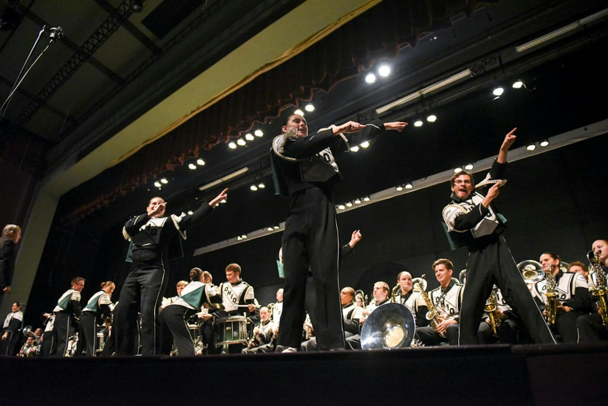 The show opened with a short video celebrating the anniversary year, which showed clips of recent shows alongside black-and-white footage of previous bands. The 110 then marched down the side aisles of the Templeton-Blackburn Alumni Memorial Auditorium and took its place on stage to the drum line’s cadences. As the band transitioned smoothly into “Stand Up and Cheer,” the crowd that filled the auditorium was on its feet, clapping to the rhythm.
