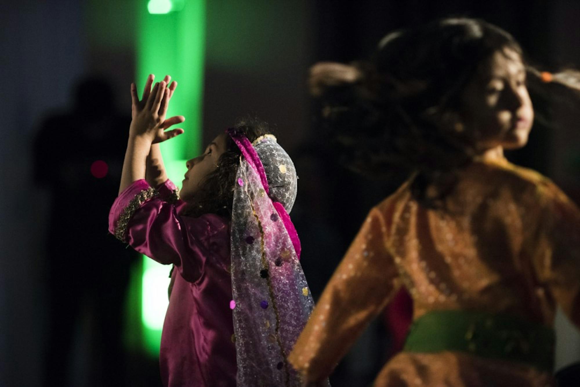 Diana Nekouei (Left) and Sara Hadizadeh (Right) dance during a performance for Yalda Night held in Walter Hall. Both girls are wearing traditional persian outfits bought by their mothers'.  (Meagan Hall | Photo Editor)