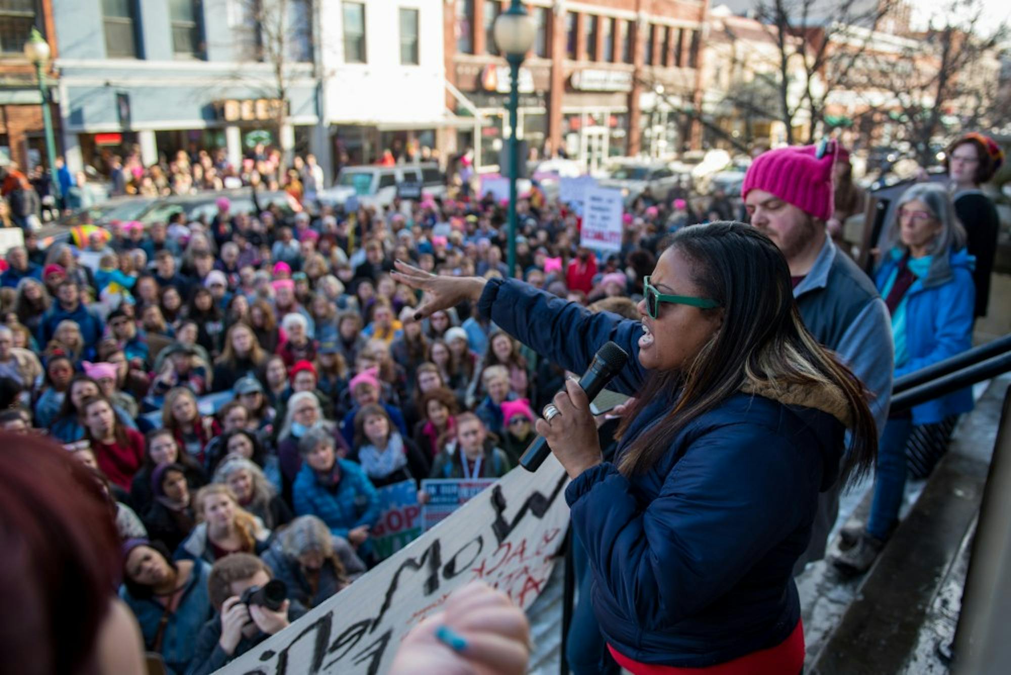 The march began at First United Methodist Church, 2 S. College Street, where people gathered and spoke about topics including Donald Trump, women's rights and Planned Parenthood. When someone asked who had attended the Women's March on Washington one year ago, about 50 people raised their hands.