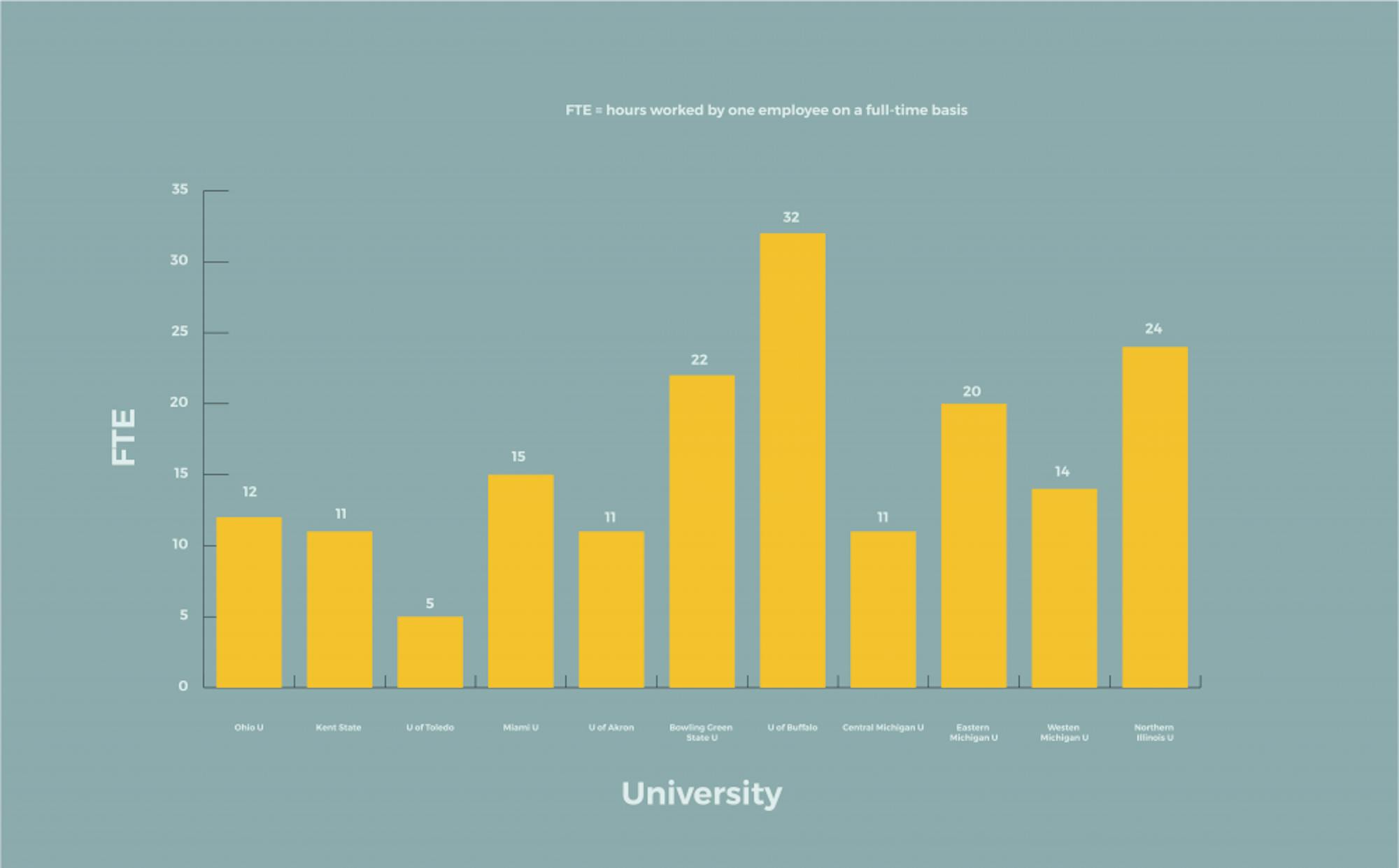 Compared to peer universities, OU’s CLDC is staffed slightly below average with 12 full-time employees and five graduate assistants on its professional staff. Of the schools used in a Board of Trustees comparison, the average university CLDC staffs about 16 full-time employees.
