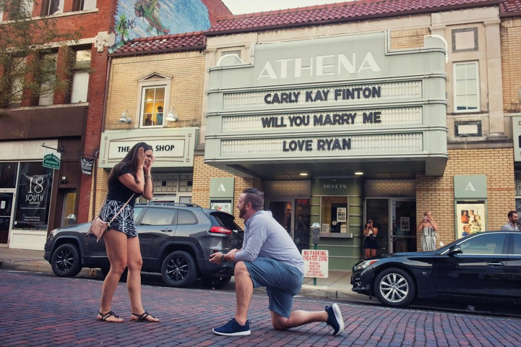 Proposals make us cry, but an Athens-style proposal makes us sob. Carly Finton, a 2015 Ohio University graduate, received a nice surprise when Ryan Schulman, also an Ohio University graduate, proposed to her on August 11 with help from the Athena Cinema marquee. The marquee displayed the words, “Carly Kay Finton, will you marry me, love Ryan.”