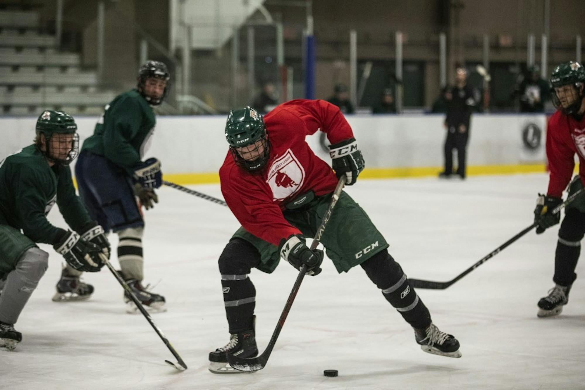 Timmy Thurnau weaves through the defense during the scrimmage that is apart of tryouts for the Ohio Bobcats Club Hockey team.